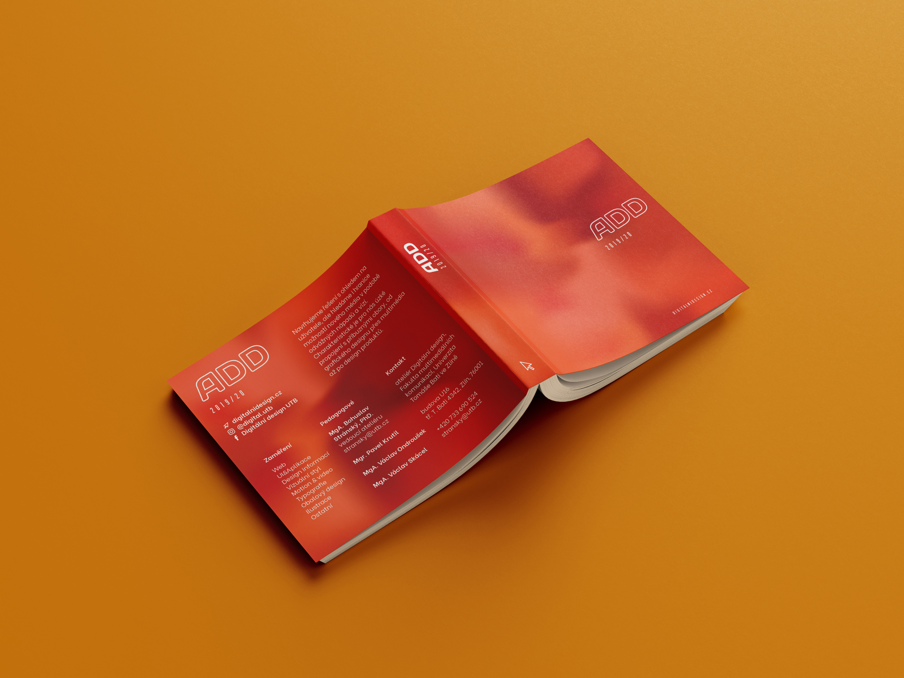 Obálka má provedení monochromního gradient mesh v univerzitních a fakultních barvách, na titulní straně s názvem, datací a webem ateliéru. Na zadní straně přebalu se pak nalézají odkazy na sociální sítě ateliéru, jeho detailní zaměření a pedagogové, doplněni kontaktními údaji.