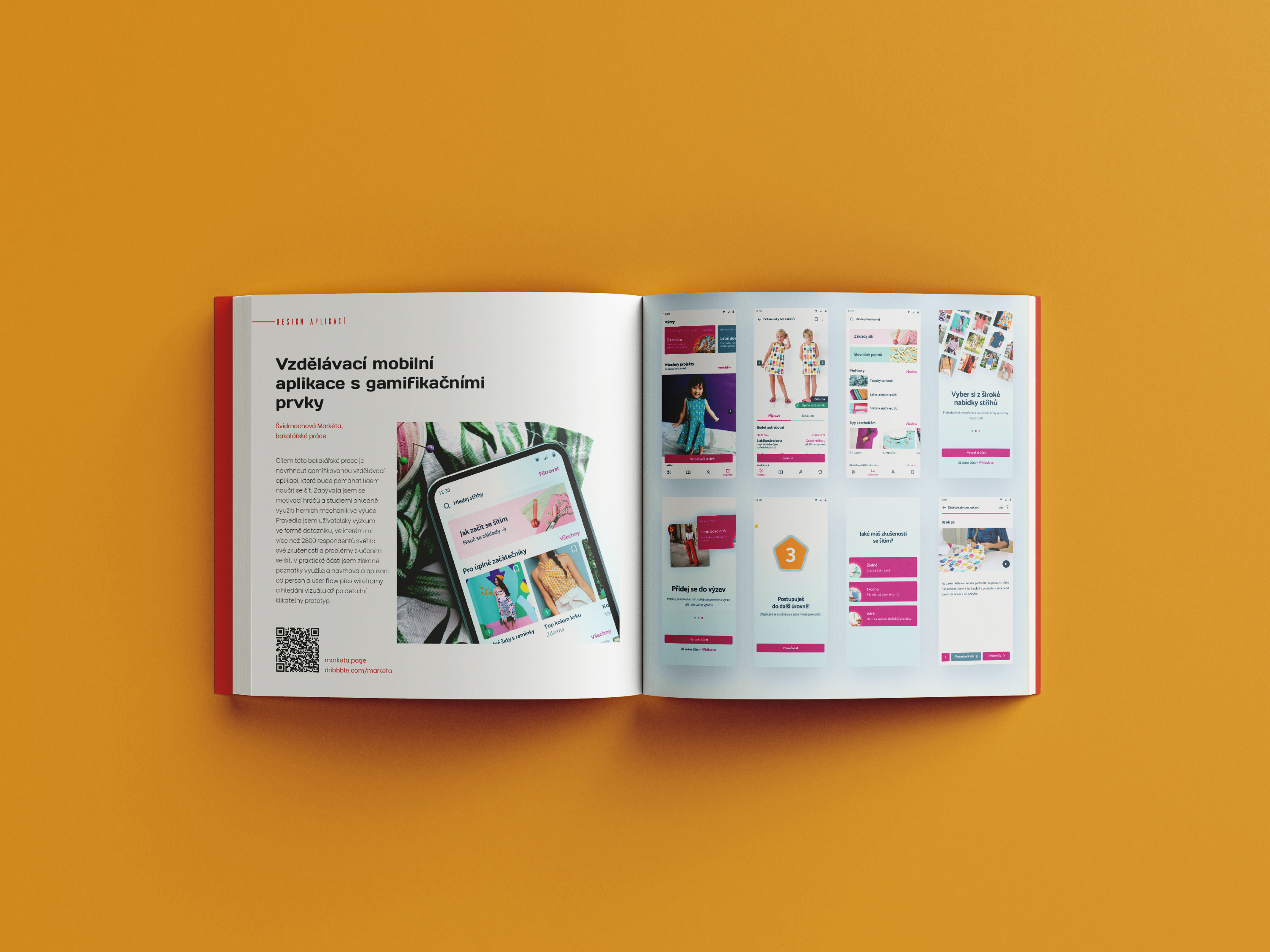 ADD tvoří rozličné projekty s rozličnými výstupy a tomuto faktu je třeba přizpůsobit rozvržení katalogu, který tyto práce promuje. Jednoduchá trojsloupcová sazba umožňuje dodržovat přehledné zrcadlo sazby a zároveň pracovat s různými rozměry výstupů, náhledů a fotografií, které studenti nahrávají a posílají k dalšímu použití při propagaci ateliéru. V záhlaví rovněž najde čtenář vždy zaměření projektu, tedy jestli se jedná o aplikaci a UI design, typografii, nebo vizuální styl, pod projektem pak QR kód, který jej odkáže na stránku projektu na webu digitalnidesign.cz. Práce je také doplněna o odkazy na autorovy stránky, služby typu Behance a Dribble, nebo instagramový nick, díky čemuž si může čtenář pohodlně prohlédnout další práce konkrétního tvůrce.