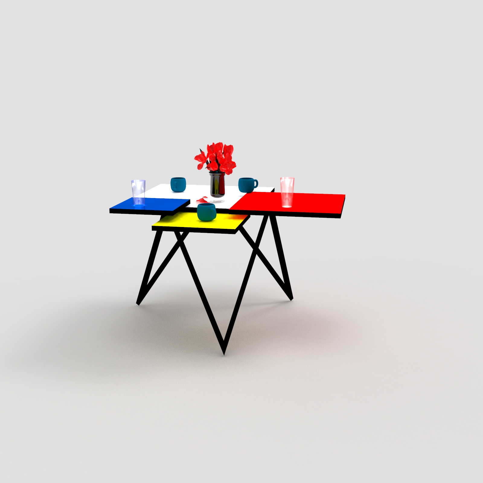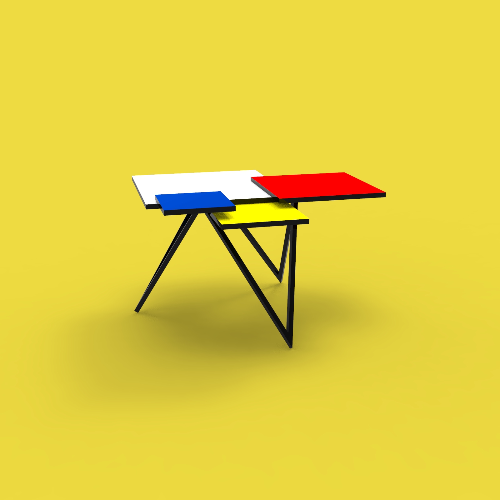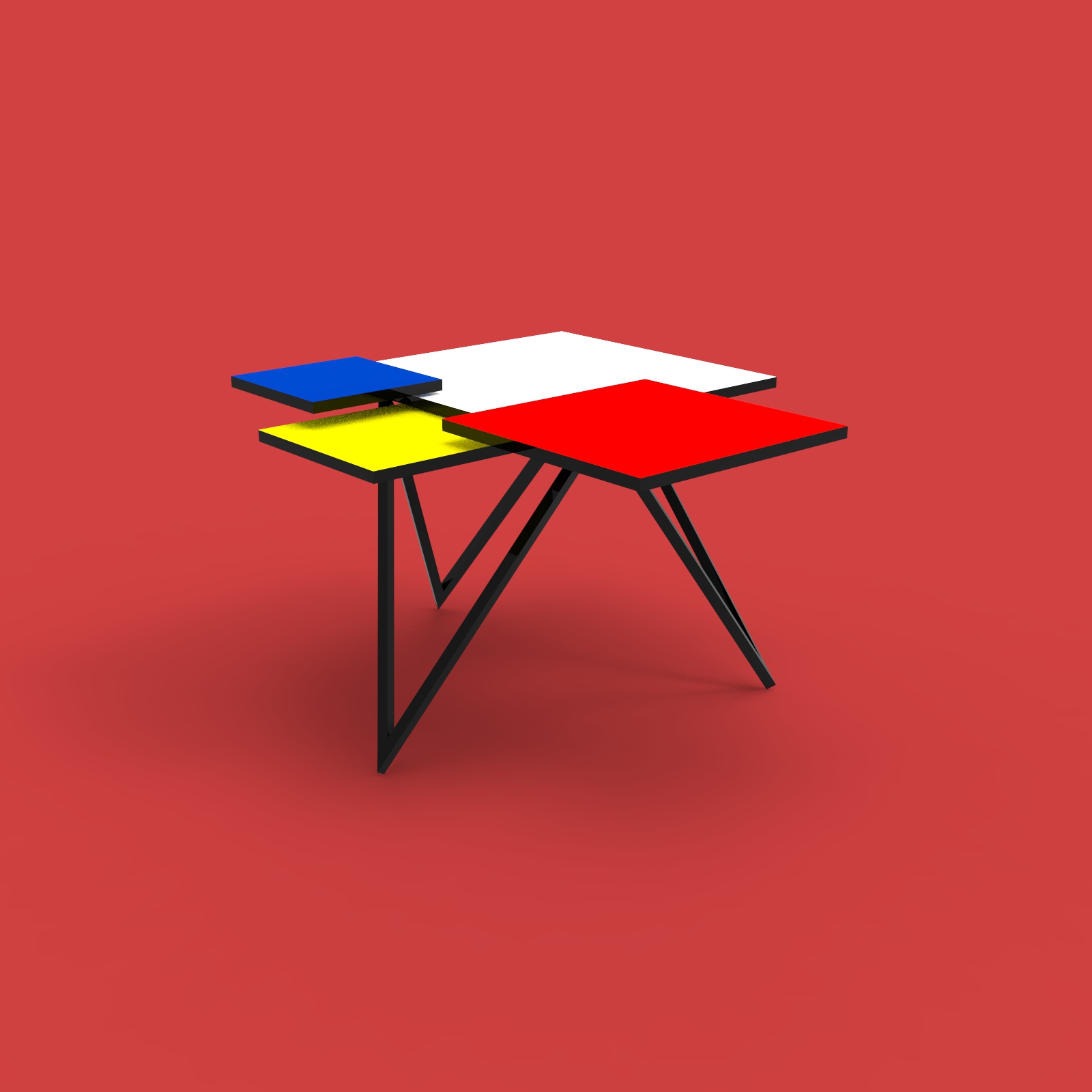 Nábytek o třech podpůrných bodech. Geometrický stolek inspirován kompozicemi Pieta Mondriana.