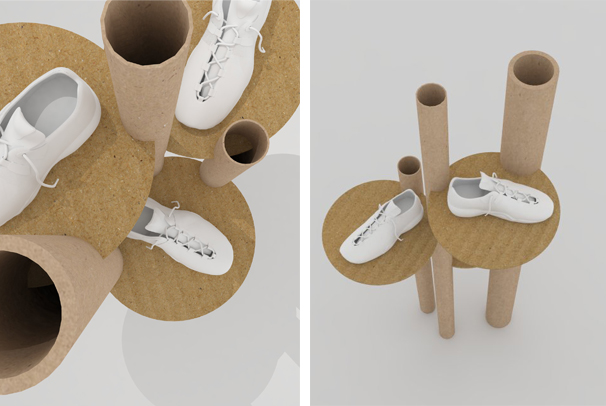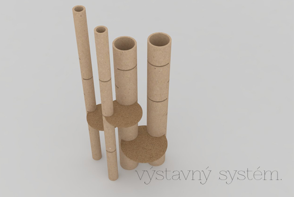 Výstavný systém bol navrhovaný z odpadových materiálov, papierových trubíc a kartónov. Vzájomným prerezávaním trubíc a zasúvaním kartónových kruhov vznikne mnoho originálnych , jedinečných výstavných stojanov.