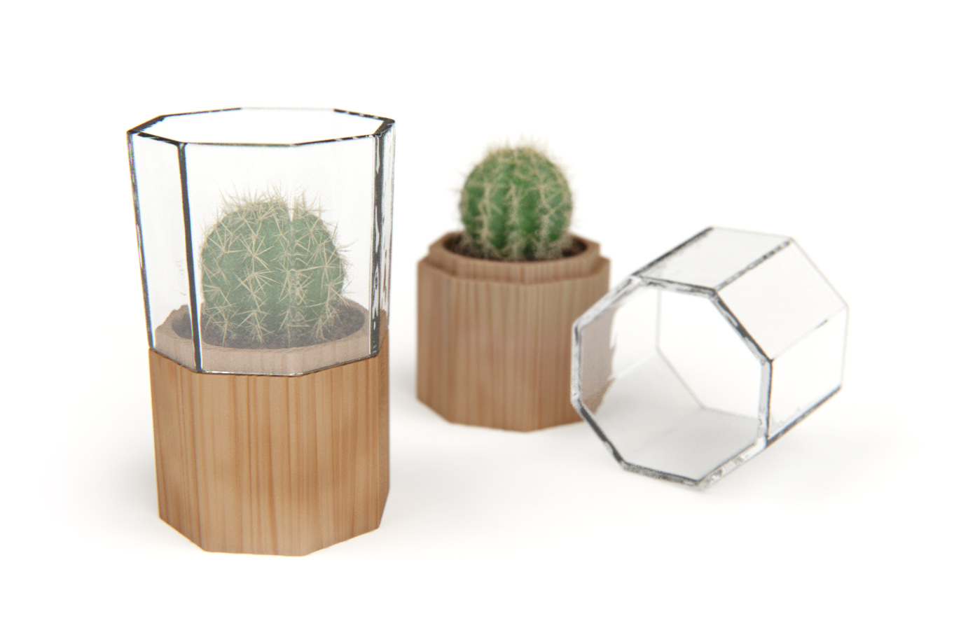 Drobný květináč na kaktus,který lze umístit na pracovní stůl nebo jím okrášlit hluchá místa. Vyroben z ořešáku ošetřeného lněným olejem a skleněnou clonou.