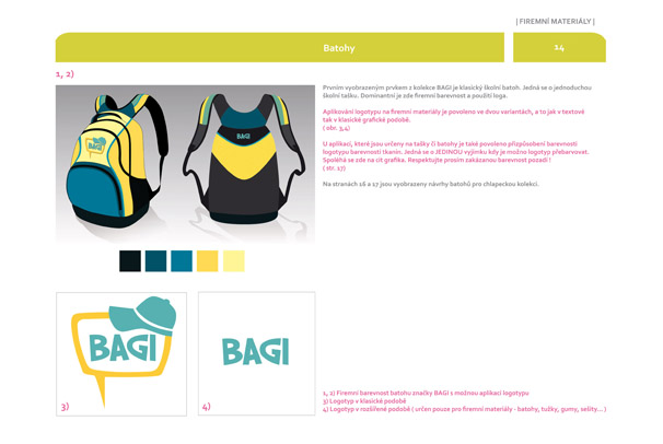 Logotyp BAGI byl vytvořen na základě ateliérového zadání - návrh a realizace nové produktové značky školních potřeb pro děti a mládež.