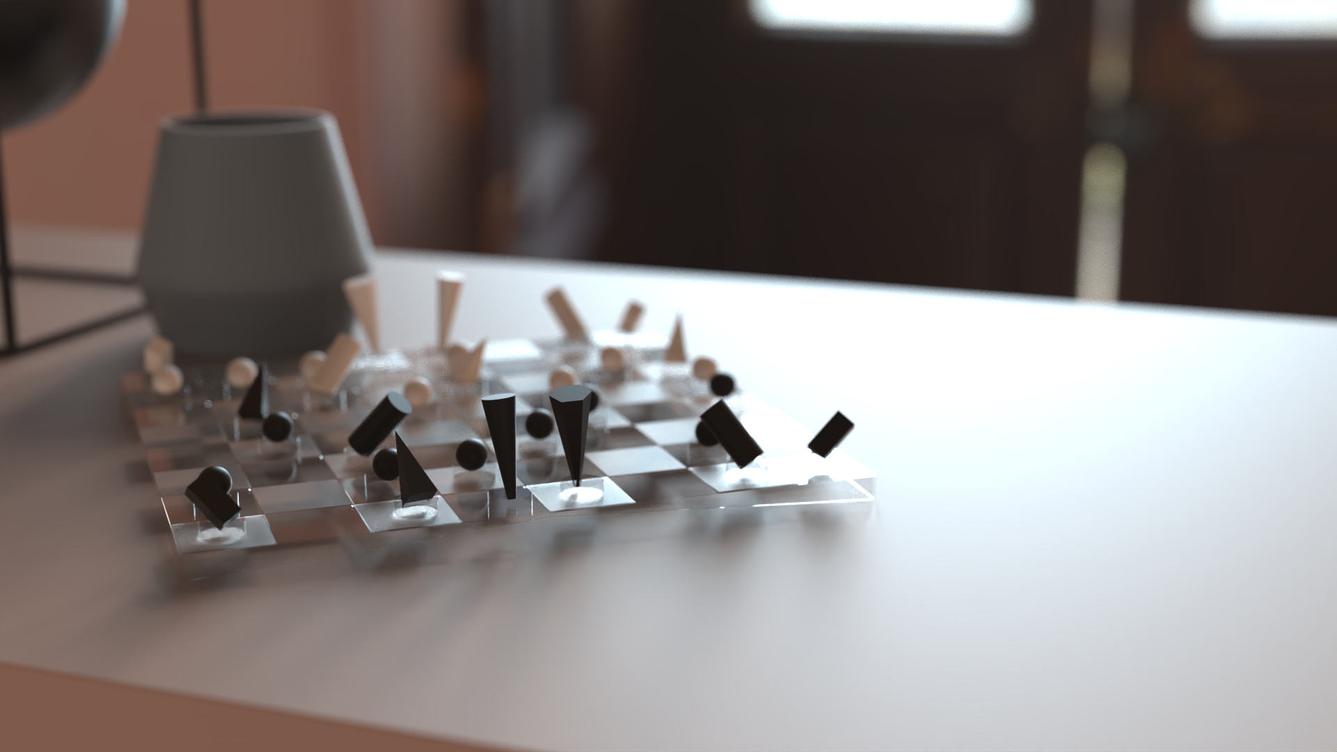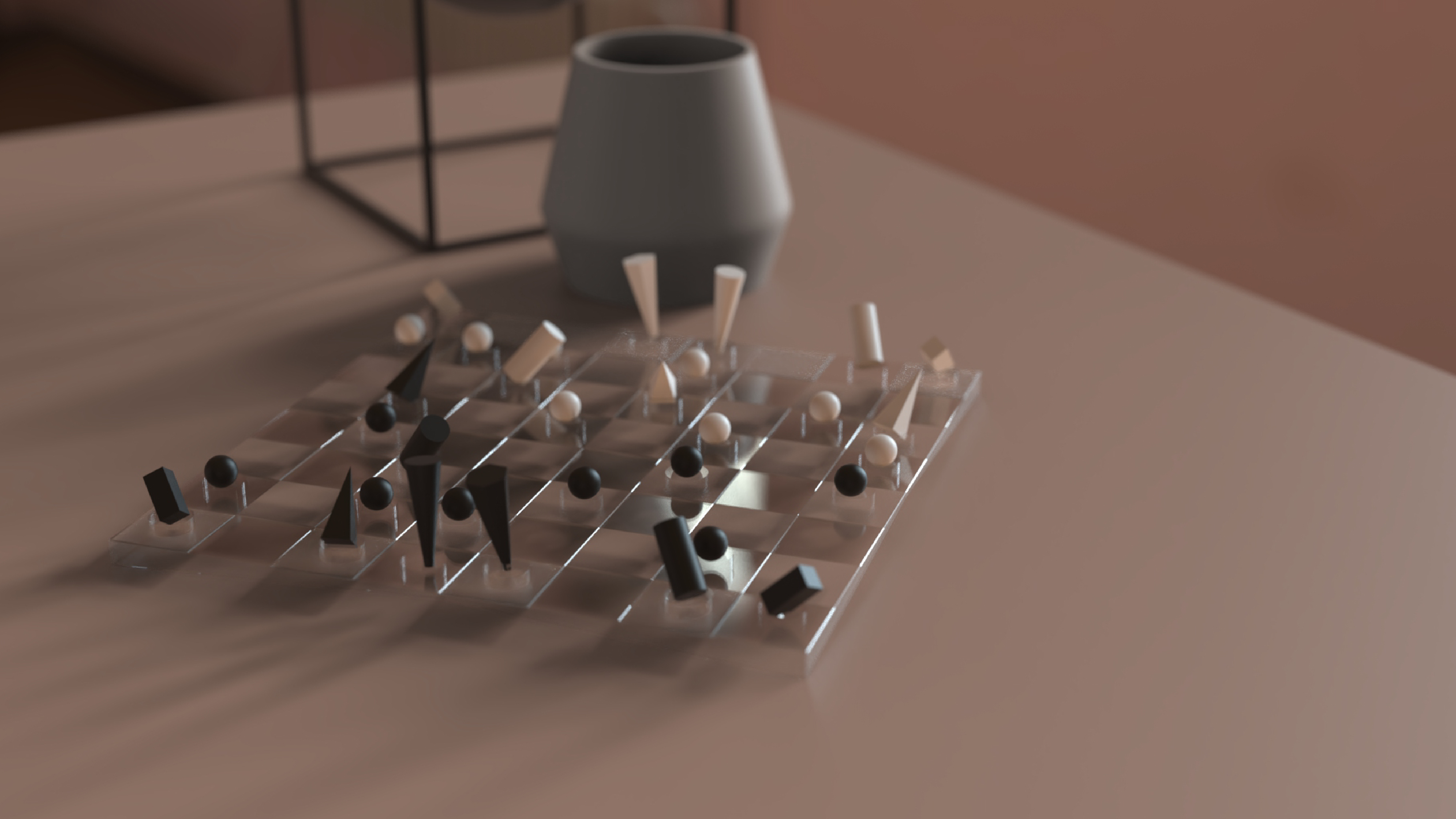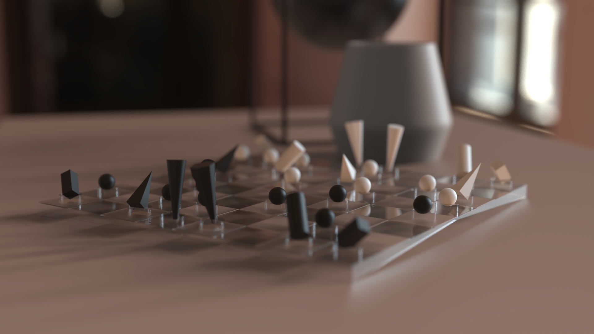 Geometrické řešení šachových figurek, využívající tvarového a materiálového kontrastu jako svých vedoucích estetických prvků. Vedoucí myšlenkou samotného designu je sblížení věkových skupin v rámci volnočasových aktivit za pomocí kombinace svěží formy a obecně známé hry.