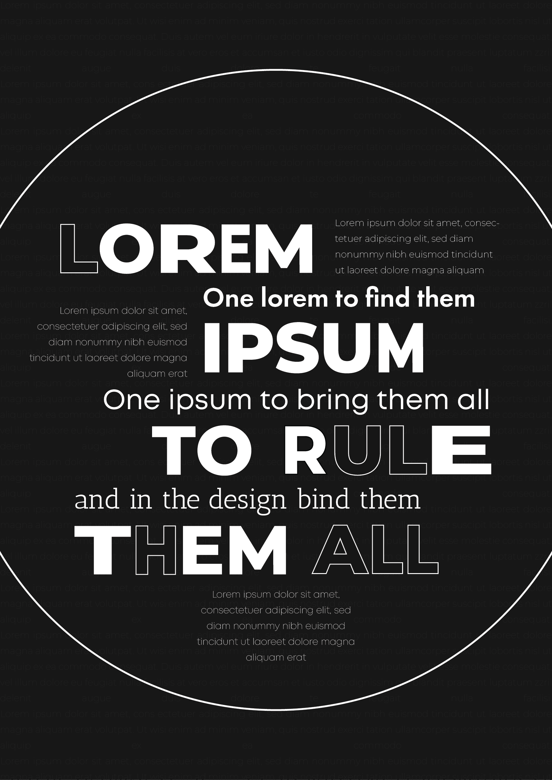 Plagát s kombináciou štyroch fontov poukazuje na prílišné používanie textu lorem ipsum a jeho prítomnosť v takmer všetkých odvetviach desingu.