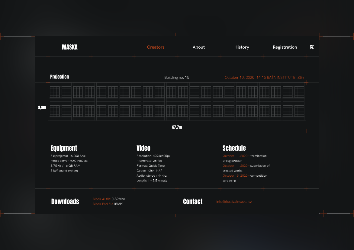 Návrh nového vebu mappingového festivalu som ladil do tmavých farieb v kombinácii so sýtou oranžovou, ktorá má poukazovať na zázemie festivalu a tehlovú fasádu Zlína a Baťovho inštitútu. Web je delený pomocou horizontálnych čiar a oranžových krížikov, ktoré odkazujú na pôvodný, horizontálne natiahnutý mapping. Web má byť jednoduchý, s použitím jemnej grafiky masky 15. budovy.