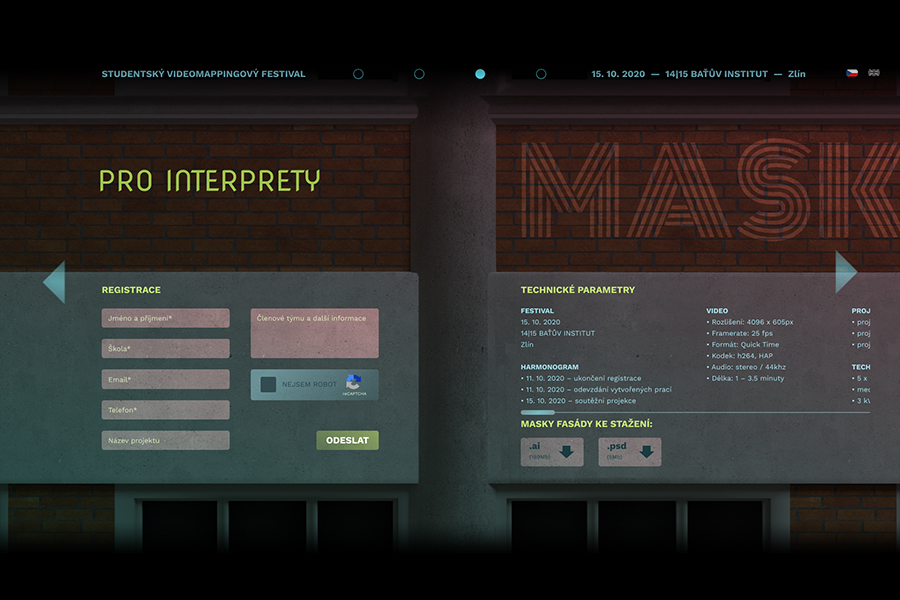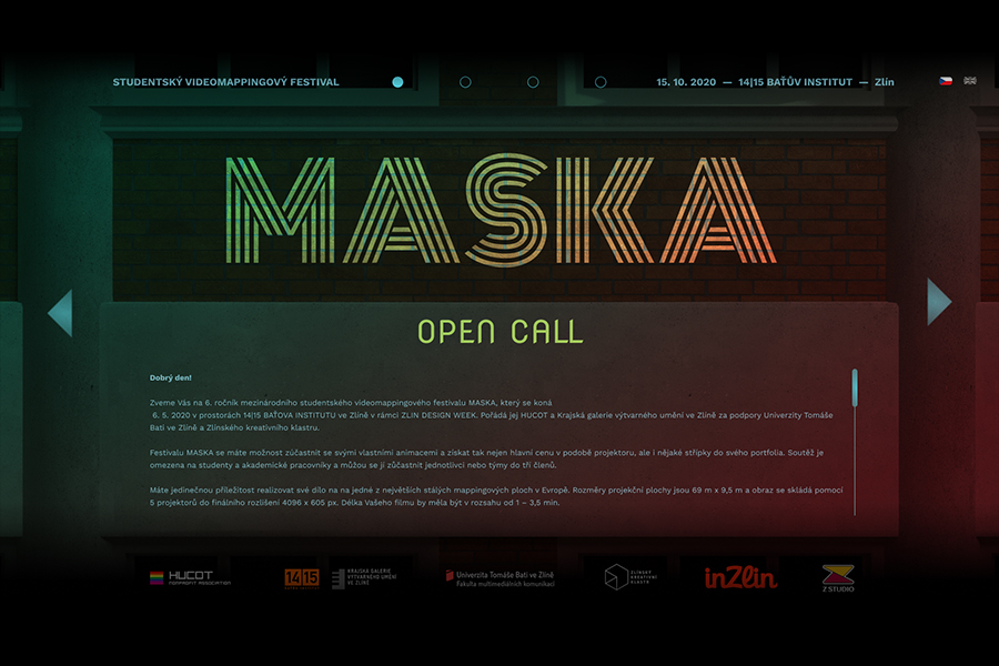Rozhraní webu pro studentský videomappingový festival Maska je inspirované samotnou akcí. Protože jsou pro ni zásadní budovy Baťova institutu, staly se výchozím motivem celého prostředí. Jednotlivé architektonické prvky určují layout, do kterého je zasazen obsah. Web se skládá ze čtyř hlavních stránek, přes které se dostaneme například k registračnímu formuláři, galerii předchozích ročníků nebo dalšímu obsahu.