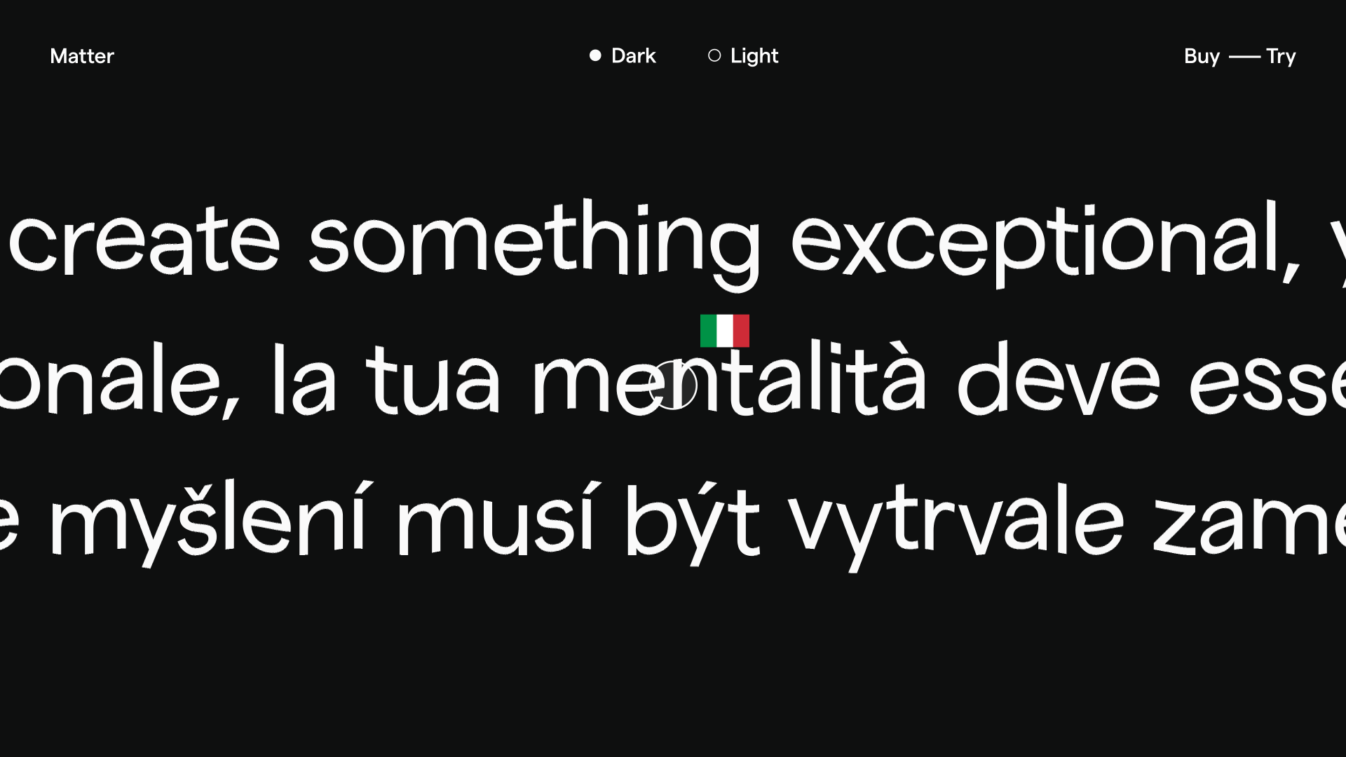 Prezentačná microsite písma s príznačným názvom Matter, ktoré vzniklo v Prahe. Web je zložený z niekoľkých častí a animácii, pričom niektoré priamo alebo skryto narážajú na Prahu či Česko. Vizuál webu nemá za potrebu byť extravagantný a preto je vytvorený v elegantnej v tmavej a inverznej verzii. Microsite v niekoľkých častiach postupne vyzdvihuje jeho silné stránky ako napr. dobrá čítateľnosť ako v nadpisoch tak i v paragrafe, podpora širokej škály diakritiky… Záver je venovaný interaktivite užívateľa pomocou „typetestera“ – napísanie si vlastného textu.