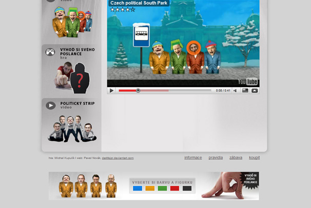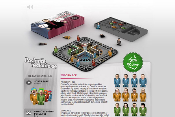 http://www.designnahranici.cz/u/p1_novak/weby/poslance/ Tento web jsem vytvořil na produkt svého spolužáka: stolní hru na princip člověče nezlob se, ale s poslanci. Pro stránku jsem taky vytvořil flash banner a videa, které můžete nalézt uvnitř. Samozřejmě že všechny postavy a události jsou vymyšlené a hru by neměl nikdo hrát. Tak co, kterou figurky byste si vyhodili vy?