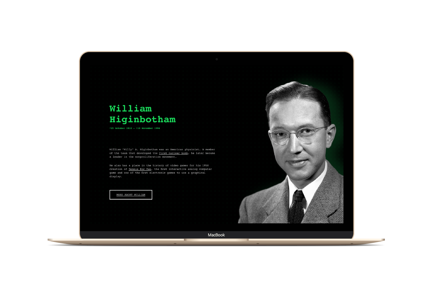 Cieľom bolo vytvoriť web pre výynamnú osobnosť. Ja som sa rozhodol vytvoriť web pre tvorcu prvej video hry. Web som sa snazil spraviť interaktívny a pútavý no na druhej strane velmi jednoduchý. Vizuál berie inspiráciu z programátorkých a technických nástrojov.