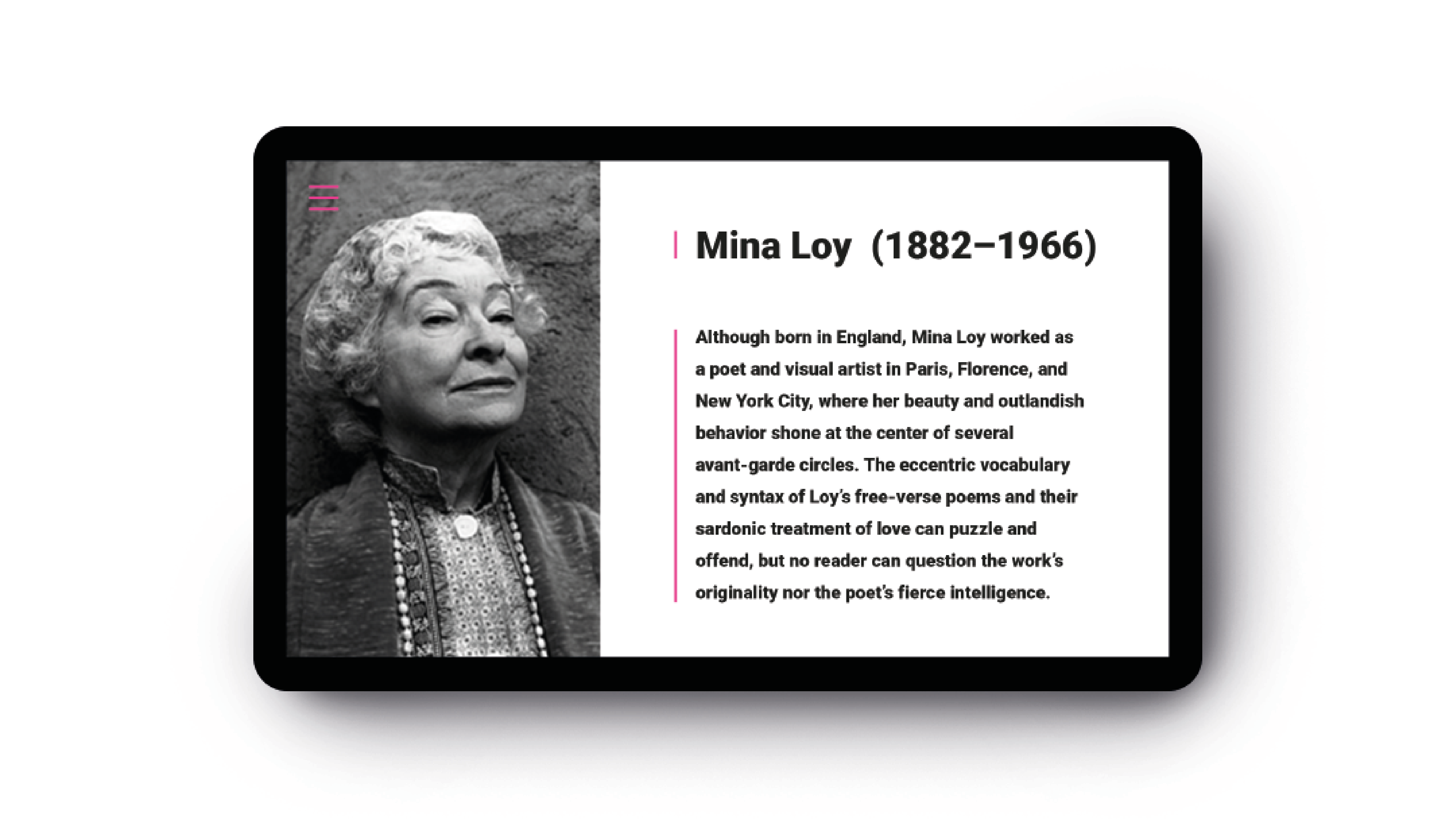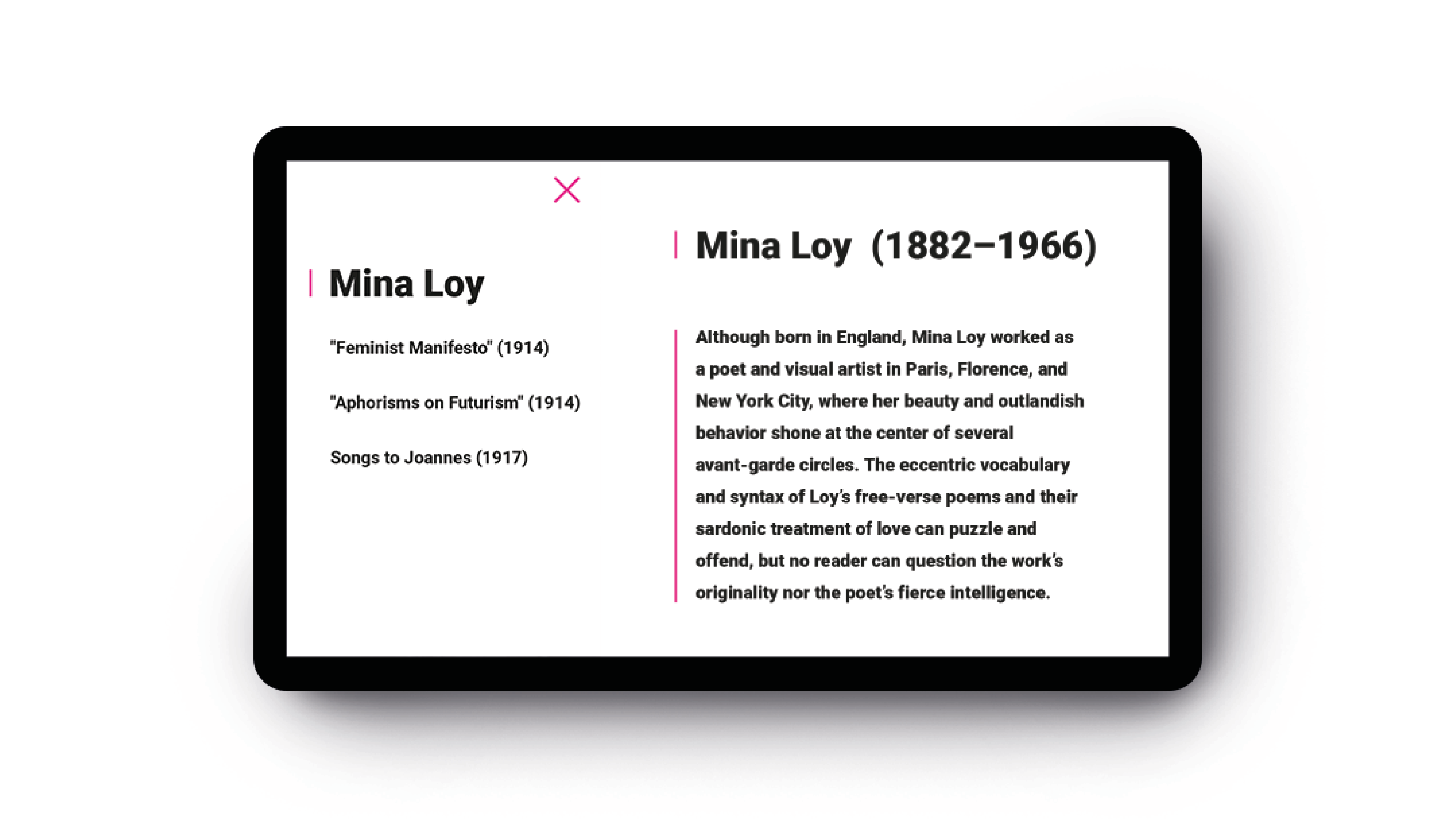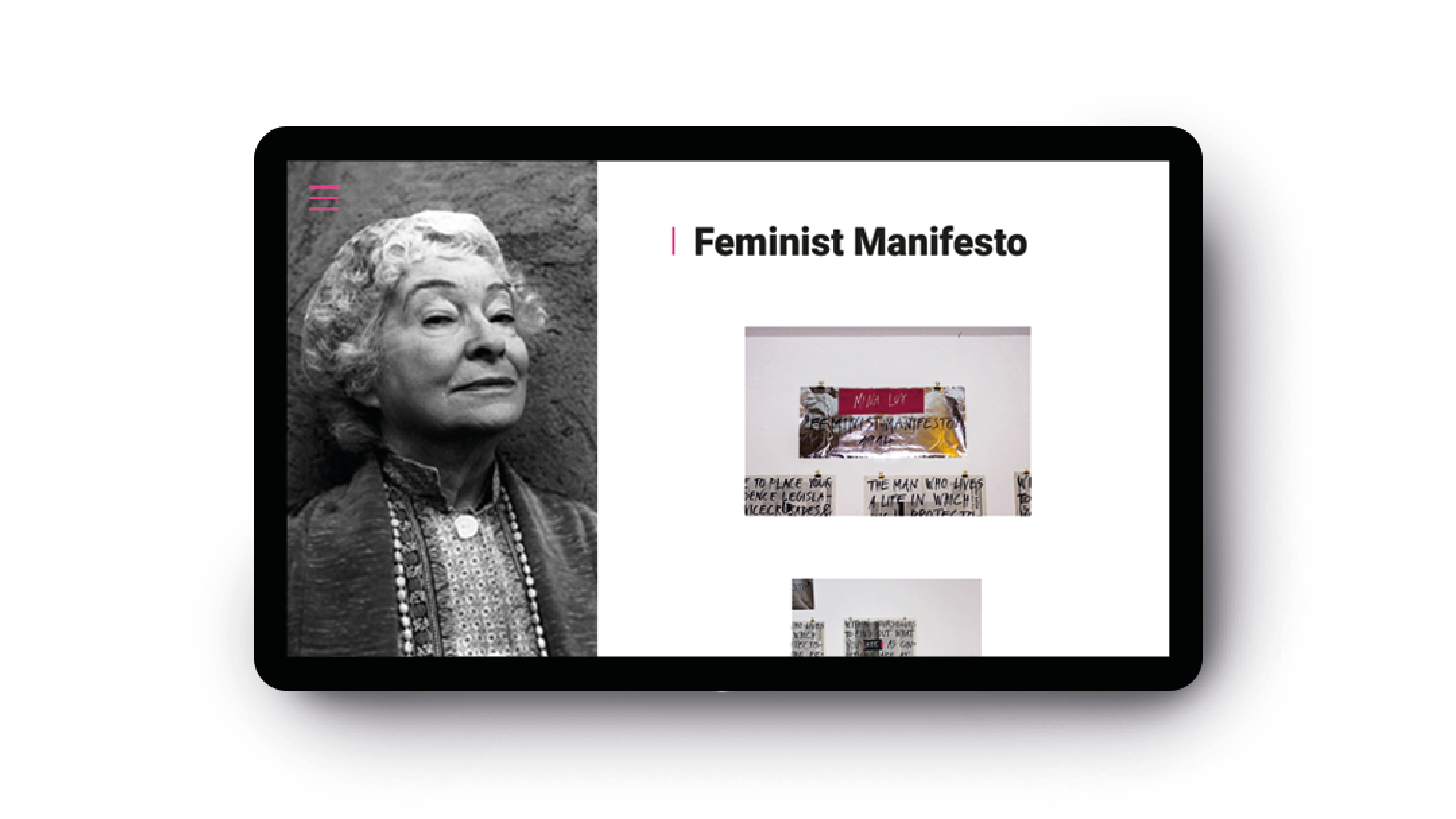 Webová stránke o poetke a feministke Mine Loy. Zamerala som sa na jej najvýznamejšie dielo Feminist Manifesto, ktorého prvé verše som prepísala na noviny a papier, čím som chcela poukázať na to, že aj v dnešnej modernej dobe je táto téma veľmi aktuálna a ľudia by si ju mali viac všímať. Vytvorením plagátov si tak ľudia viac všimnú text, ktorý je stále tak aktuálny napriek tomu že bol vytvorený pred vyše jedným storočím. // EN: Webpage about feminist, british artist, writer, poet, playwright, novelist, designer of lamps and bohemian, Mina Loy. My main target is Feminist Manifesto which First verses I hand wrote on paper as a reaction od feminist theme what is topical these days as well as it was more than century ago.