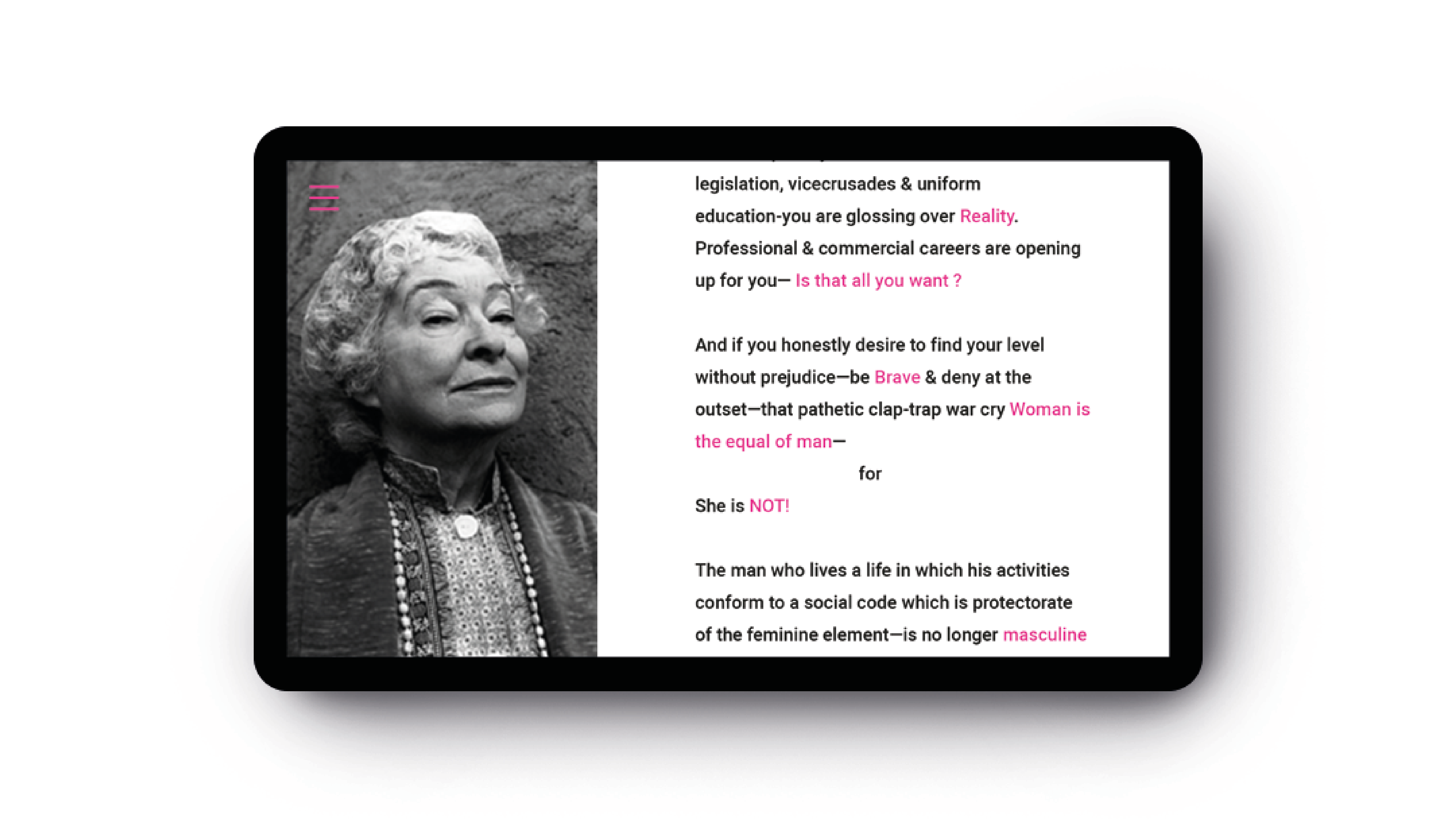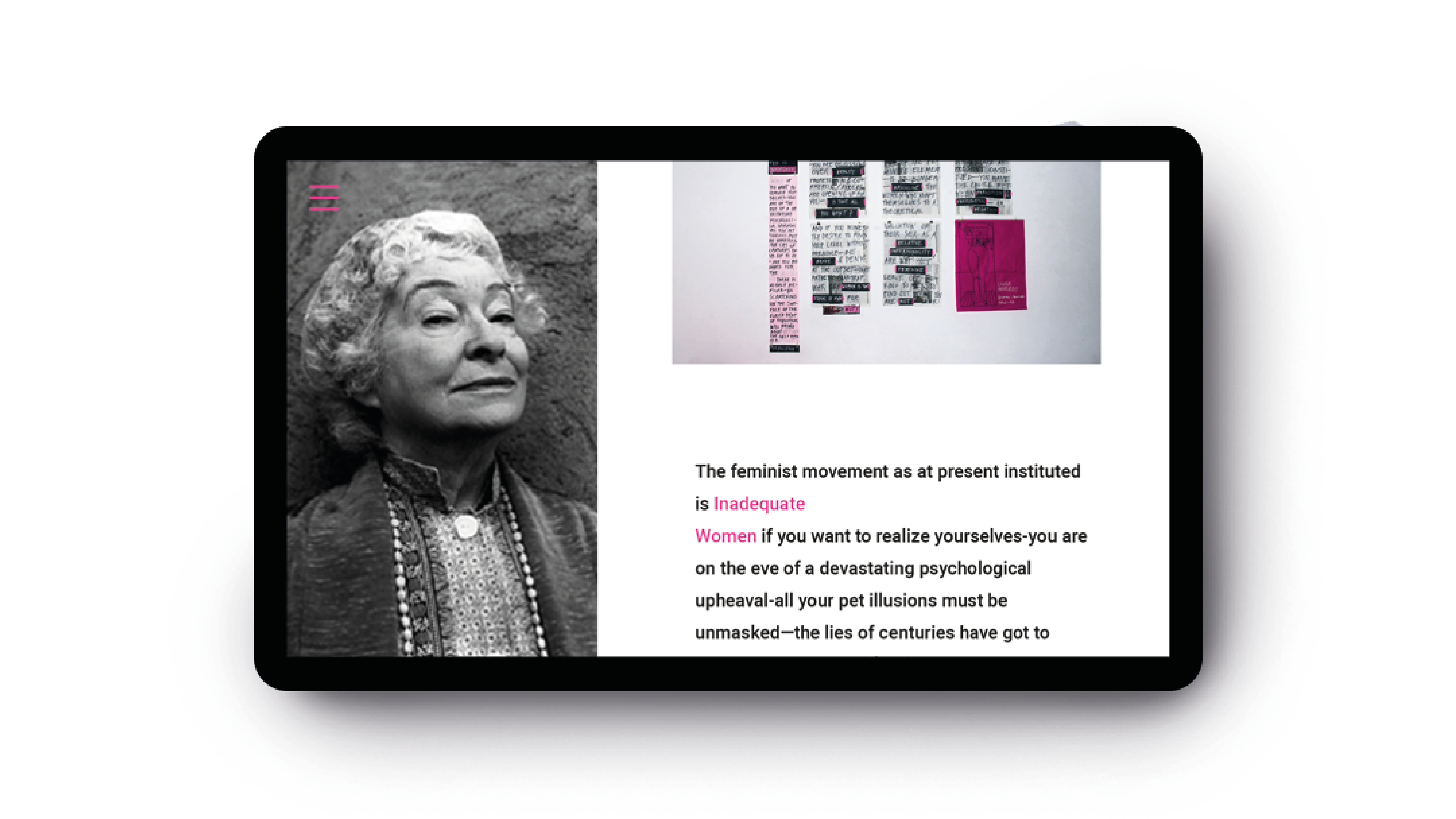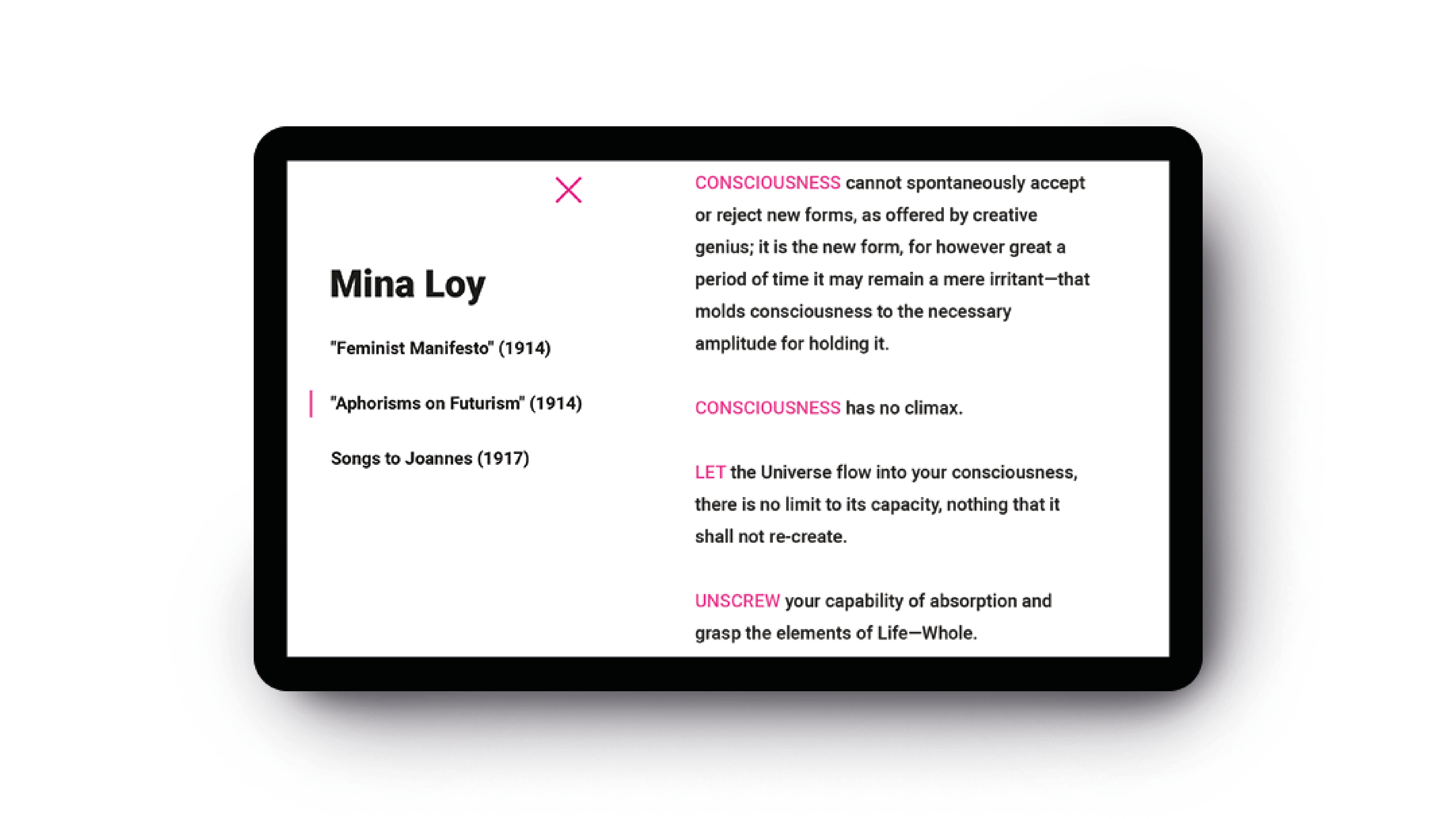 Webová stránke o poetke a feministke Mine Loy. Zamerala som sa na jej najvýznamejšie dielo Feminist Manifesto, ktorého prvé verše som prepísala na noviny a papier, čím som chcela poukázať na to, že aj v dnešnej modernej dobe je táto téma veľmi aktuálna a ľudia by si ju mali viac všímať. Vytvorením plagátov si tak ľudia viac všimnú text, ktorý je stále tak aktuálny napriek tomu že bol vytvorený pred vyše jedným storočím. // EN: Webpage about feminist, british artist, writer, poet, playwright, novelist, designer of lamps and bohemian, Mina Loy. My main target is Feminist Manifesto which First verses I hand wrote on paper as a reaction od feminist theme what is topical these days as well as it was more than century ago.