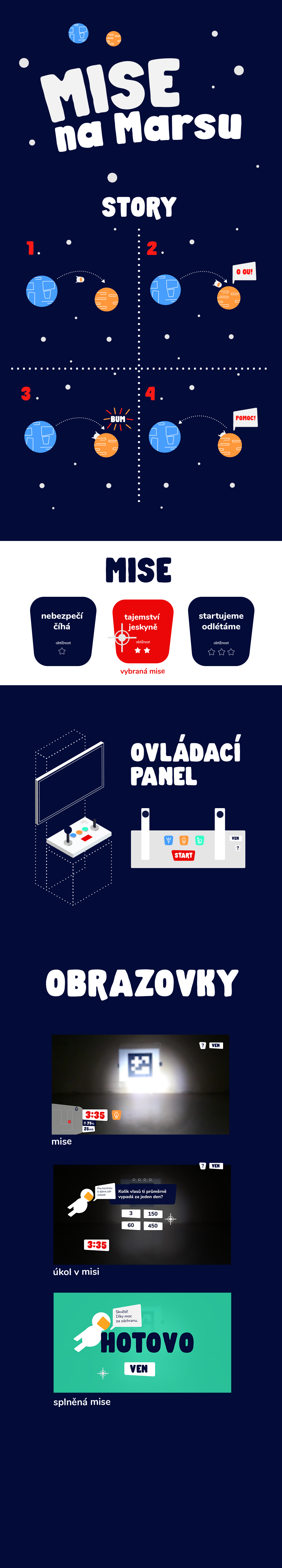 Návrh herního rozhraní pro připravovanou interaktivní instalaci ve spolupráci s VUT. Celý příběh začíná ztroskotáním vesmírné lodi na Marsu. Robot z díly VUT je následovně vyslán na misi, aby zachránil bezmocnou posádku. Hráč si může volit mezi třemi variantami misí (podle obtížnosti). Při každé z nich se pochybuje robotem pomocí ovladačů po hracím poli a díky kameře sleduje jeho cestu. V každé misi je nutné použít jednu z funkcí robota (světla, laser, zvedák) - prvky úkolů jsou zobrazovány pomocí rozšířené reality.