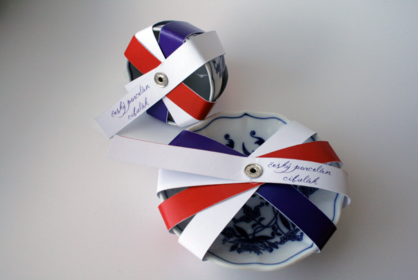 Tradiční český porcelán je zabalen do papírových proužků, které vytvářejí dojem cibule. Barvy jsem volila výhradně české, tzn. naše trikolora.