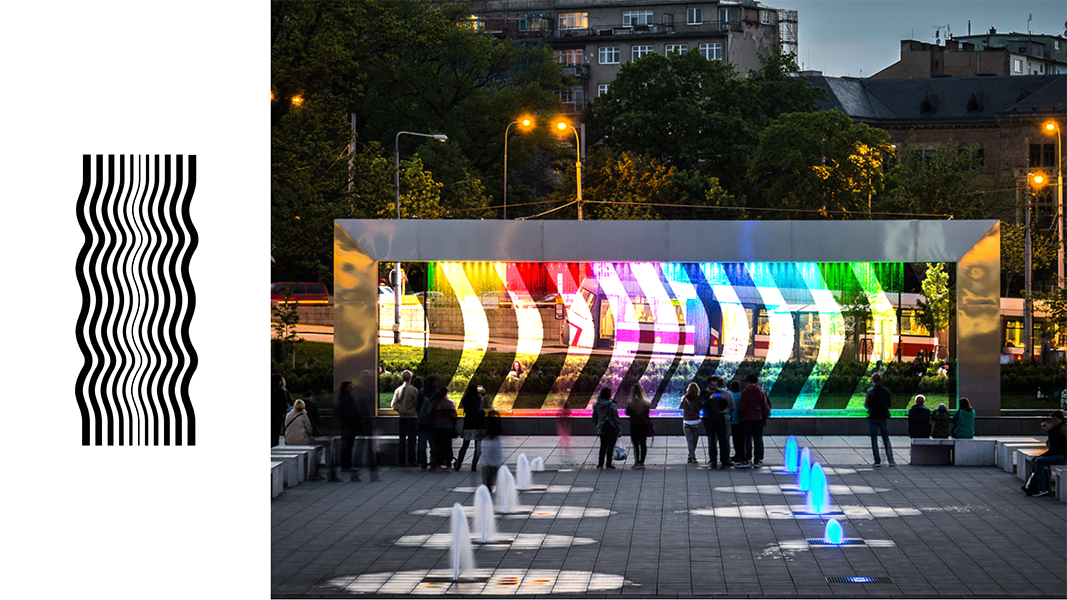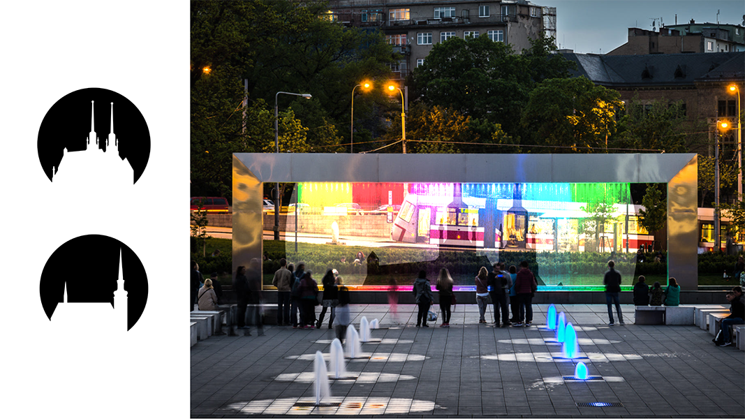 Motívy pre svetelnú fontánu v Brne. Brnenské dominanty: Kostol sv. Jakuba a Petrov sú čo najviac zbavené detailov pre ich čitateľnosť.