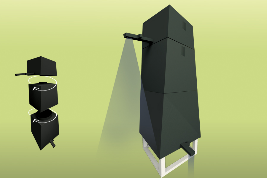 Téma Mine Urban Gardening. Nádrž lze šroubovat do sebe, takže si můžete poskládat nádrž jak velkou chcete. Sprcha v horní nádobě má přepad a filtr na vodu