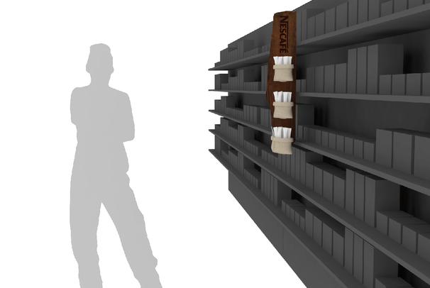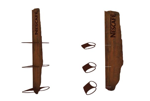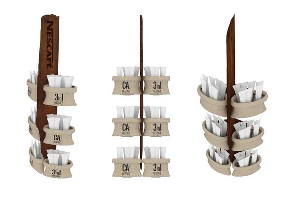 Stojan prezentuje balíčky kávy Nescafé, v přírodním materiálu ve formě malých imitací pytlů