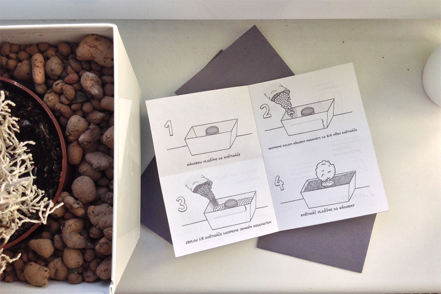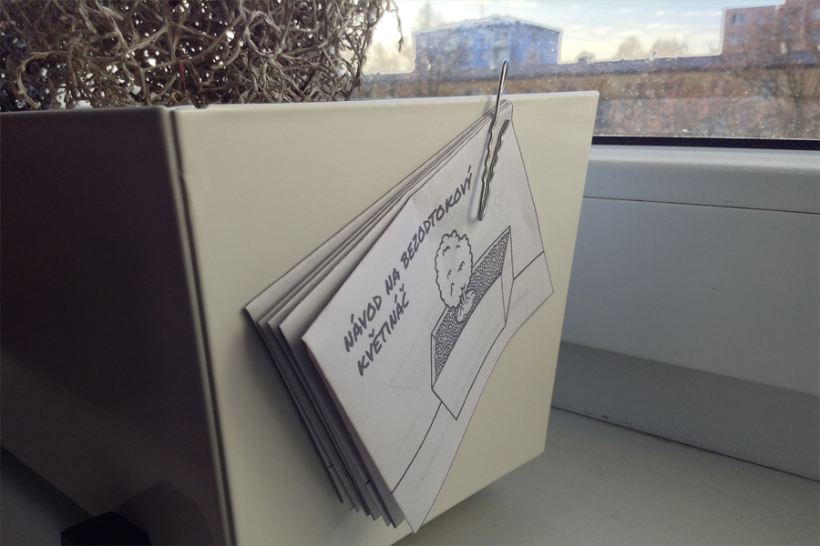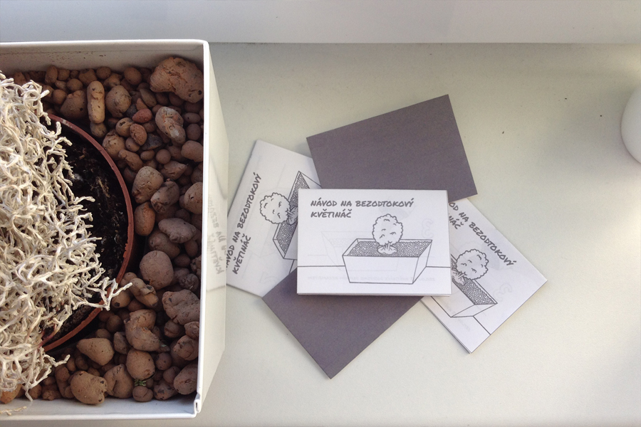 Jako návod jsem vytvořil postup pro efektivní využití bezodtokového květináče. Tvořil jsem zapomocí ručních kreseb, které jsem následně naskenoval do počítače a upravil. Výsledný formát je 9 x 6,5cm a je tisknut v odstínech šedi.