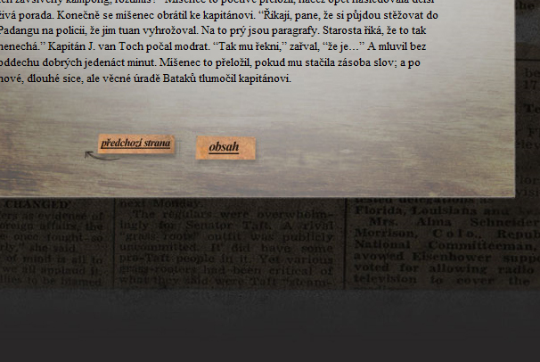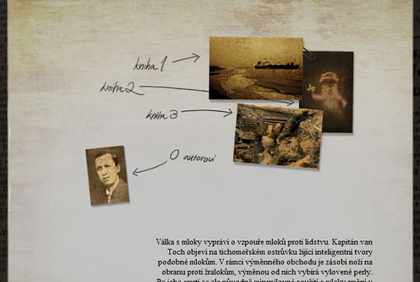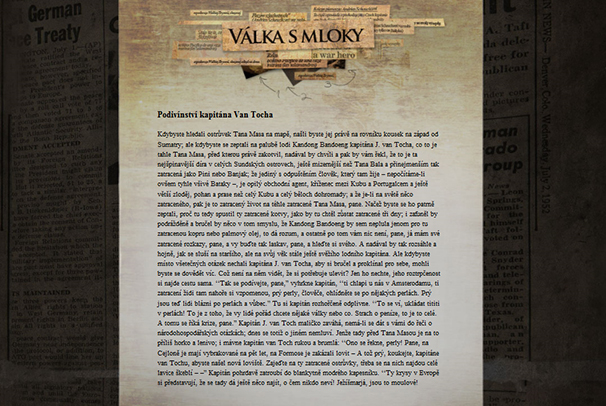 Jedná se o web vytvořený ve stylu stylizovaných novinových výstřizků, symbolizující druhou část knihy, ve které je zkoumán děj války zkrz staré výstřizky z novin. https://hydra.fmk.utb.cz/~p_augustin/web/index.html