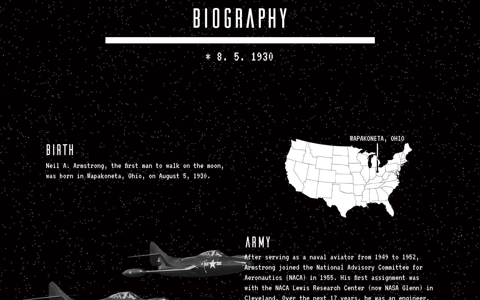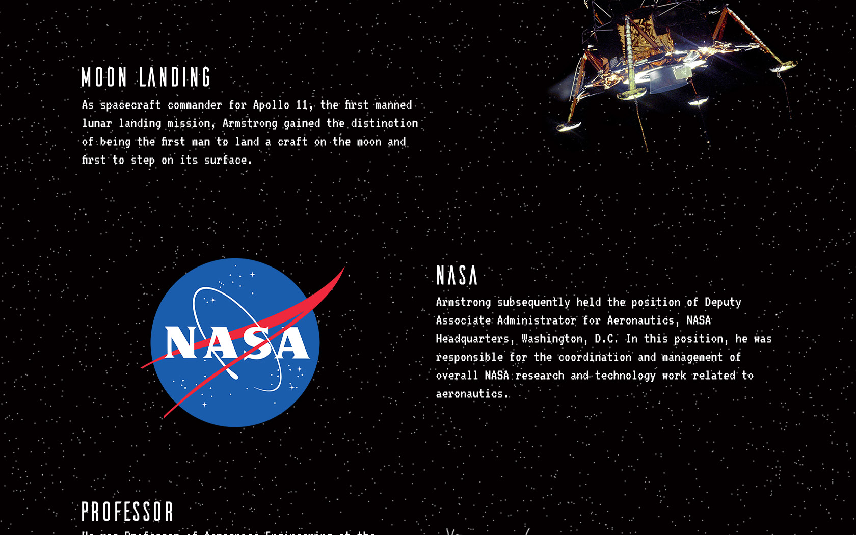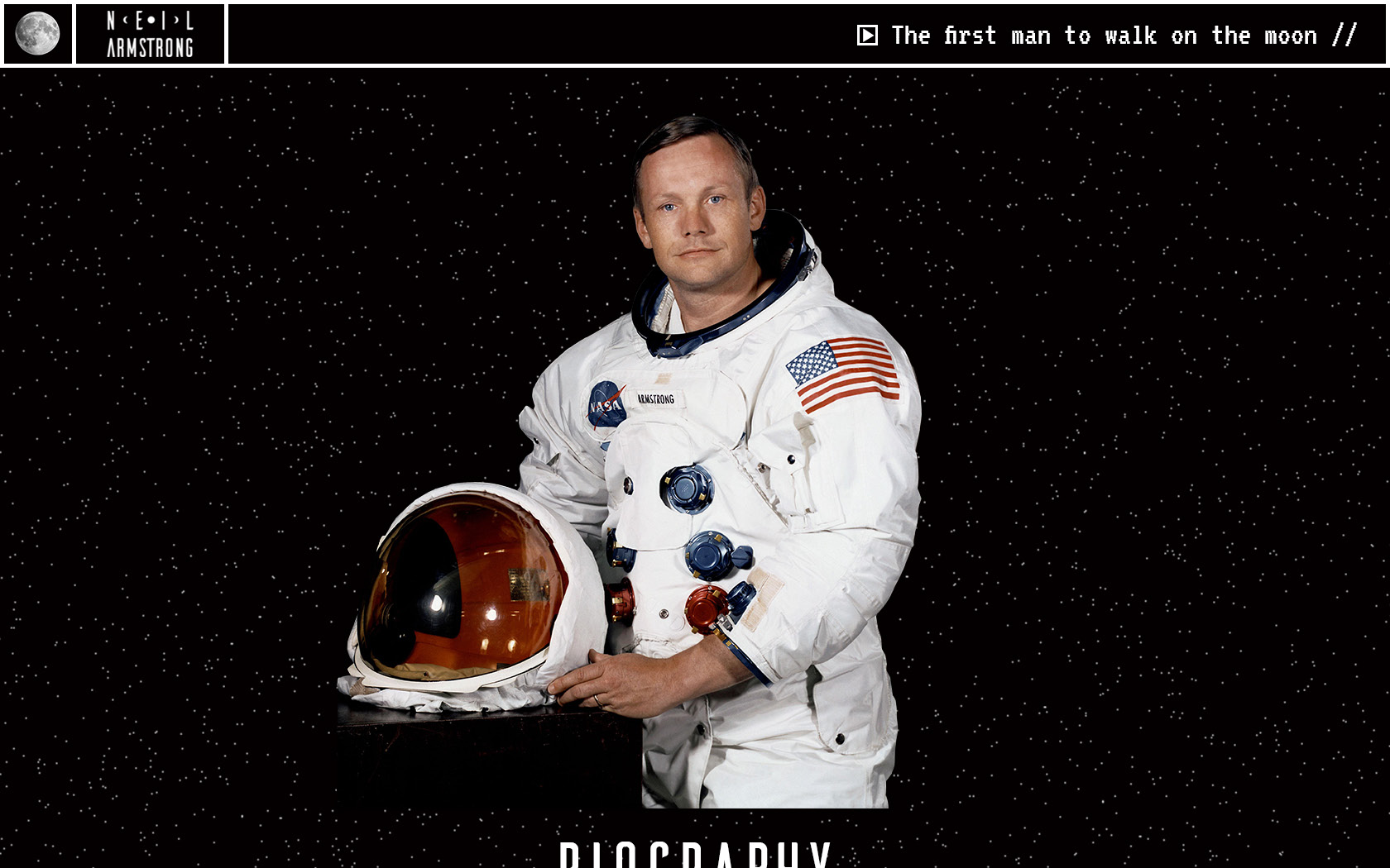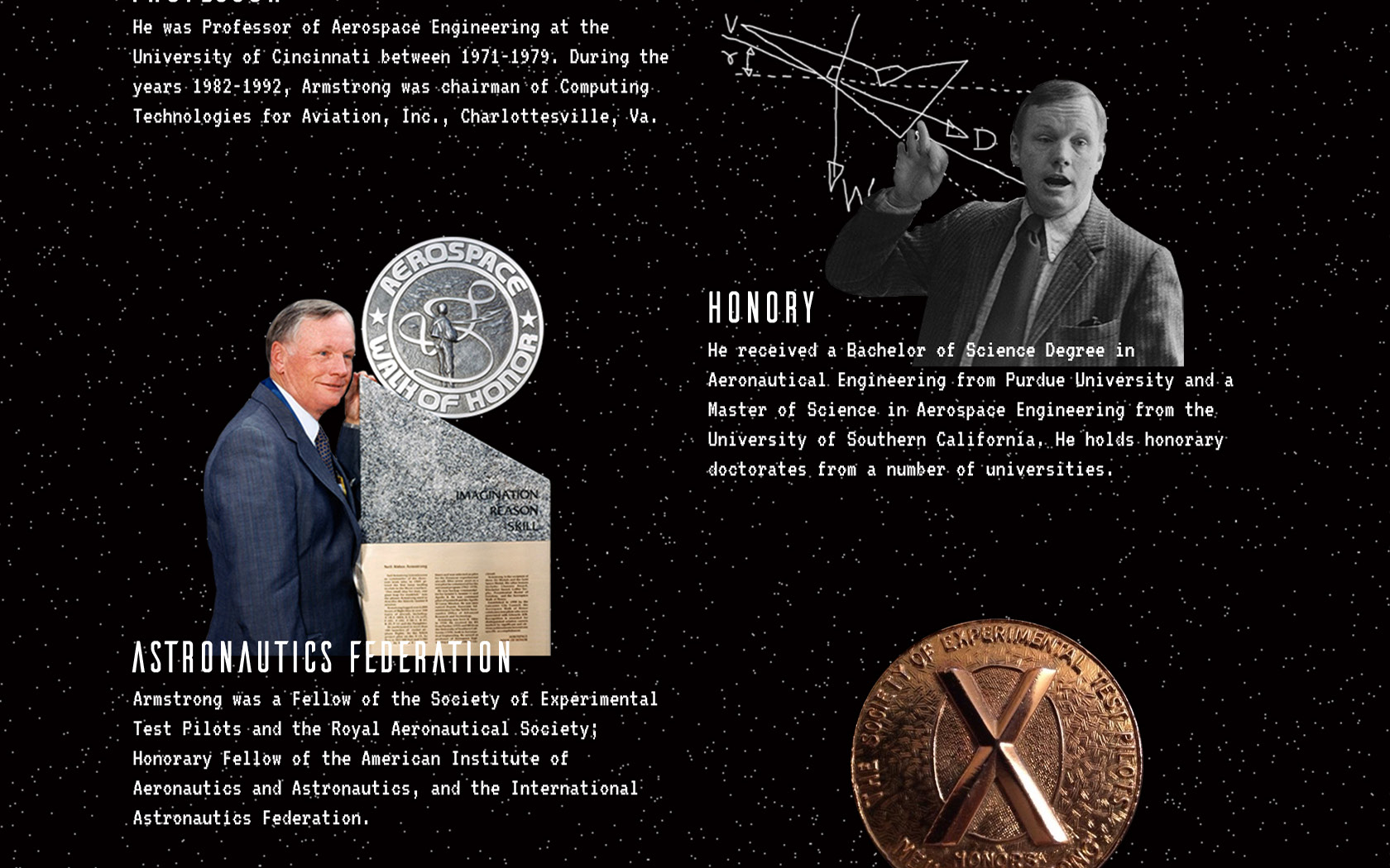 Web slouží jako pocta muži, který jako první člověk vstoupil na měsíc a nejen to. Písmo Ailerons, je inspirováno leteckým písmem čtyřicátých let 20. století v době kdy Neil Armstrong vyrůstal. Další font (VT323), symbolizuje techniku té doby, se kterou doletěli až na měsíc.
