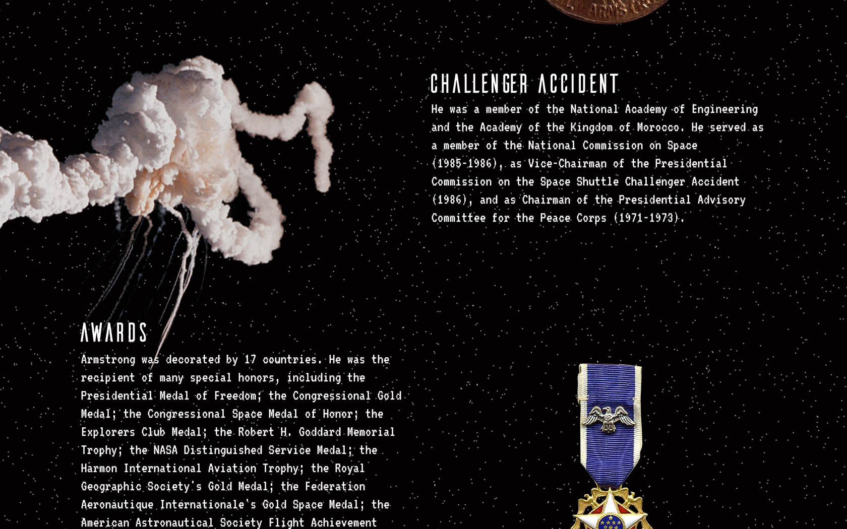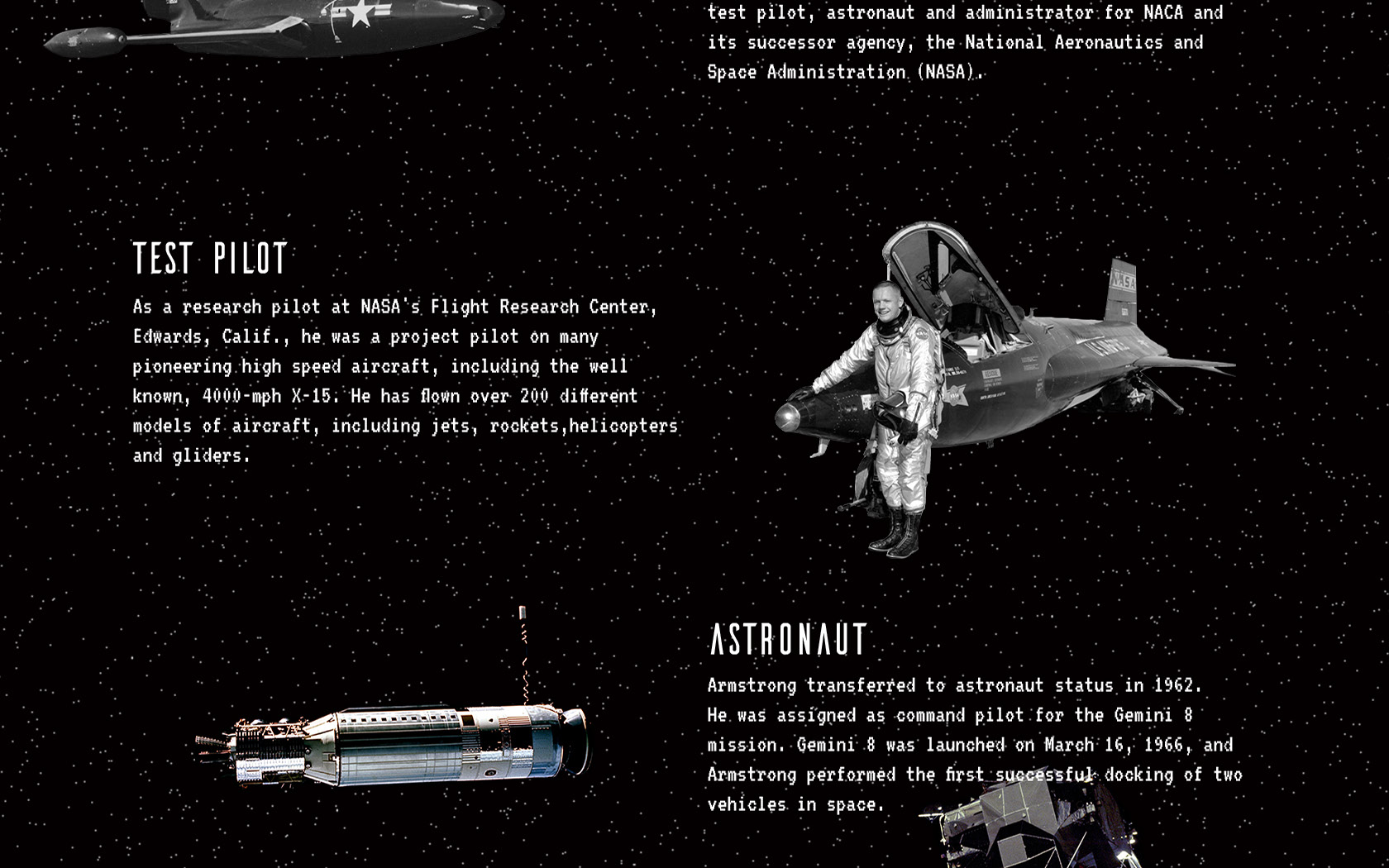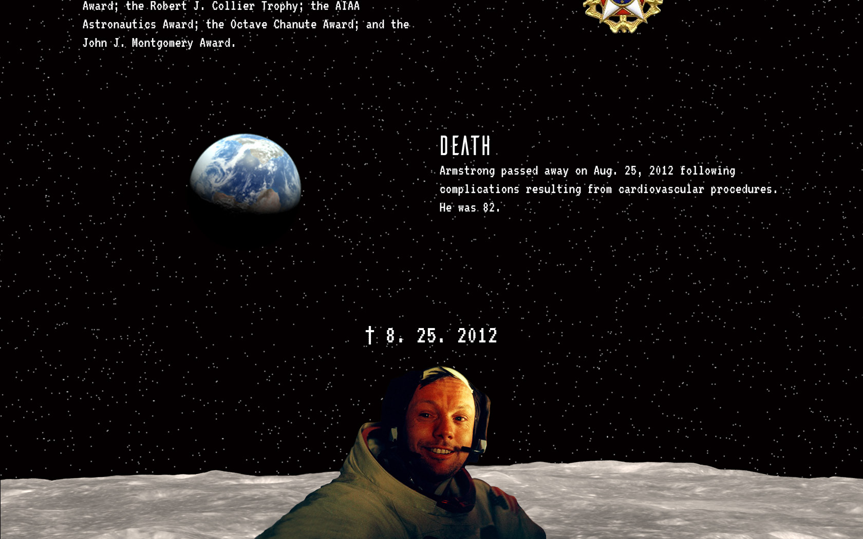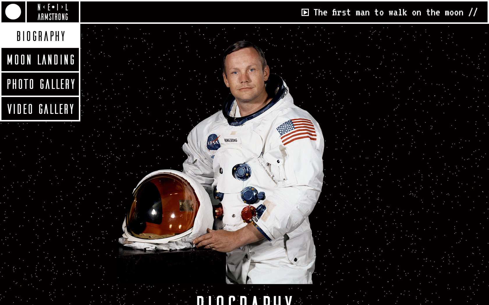 Web slouží jako pocta muži, který jako první člověk vstoupil na měsíc a nejen to. Písmo Ailerons, je inspirováno leteckým písmem čtyřicátých let 20. století v době kdy Neil Armstrong vyrůstal. Další font (VT323), symbolizuje techniku té doby, se kterou doletěli až na měsíc.