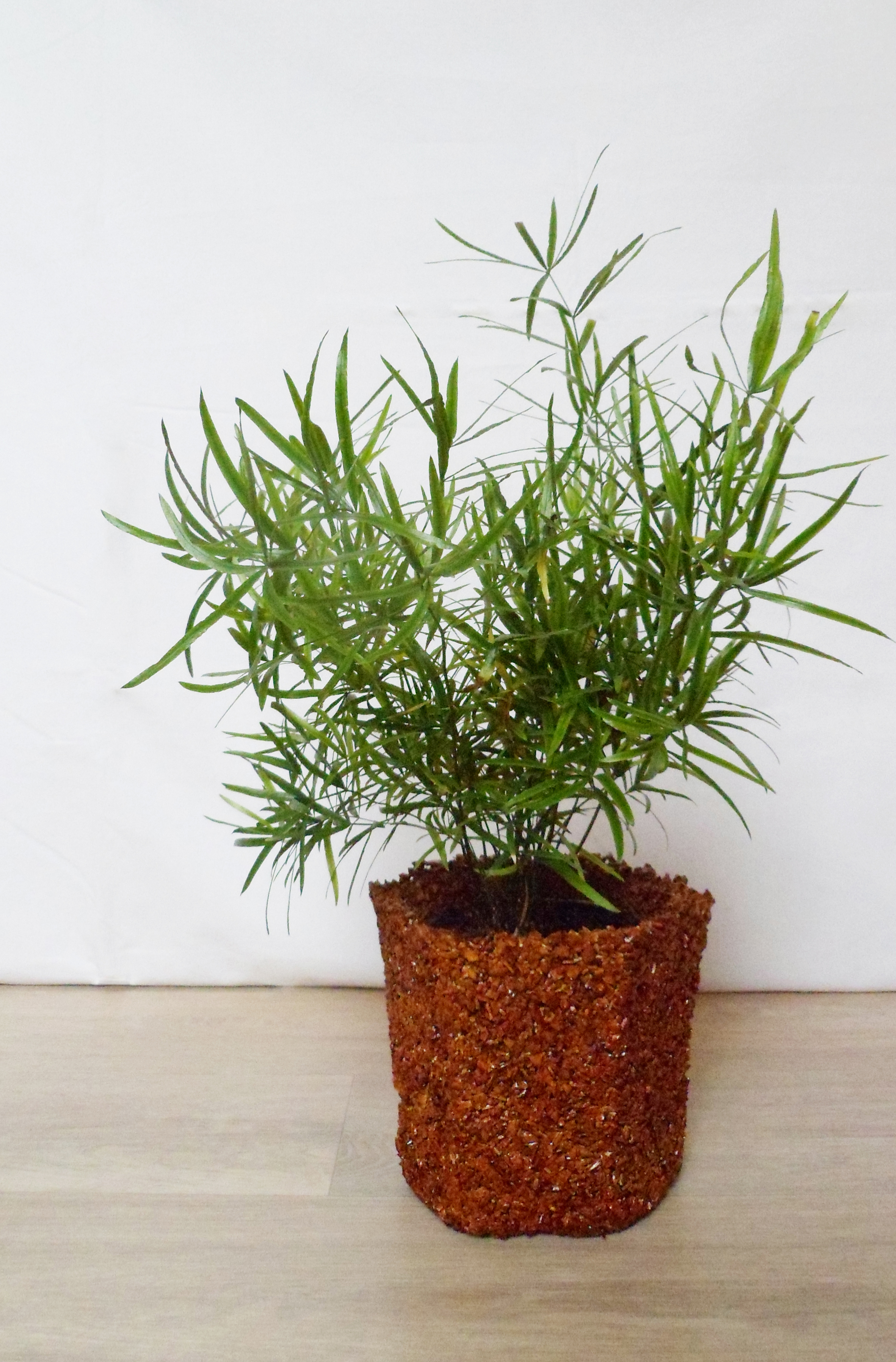 Květináč je vyrobený z rozdrcených skořápek z vlašských ořechů. Ořechy jsou spojeny Herkulesem a vytvarovány v polystyrenové formě. Celý květináč je přelakovaný, aby byl odolnější.