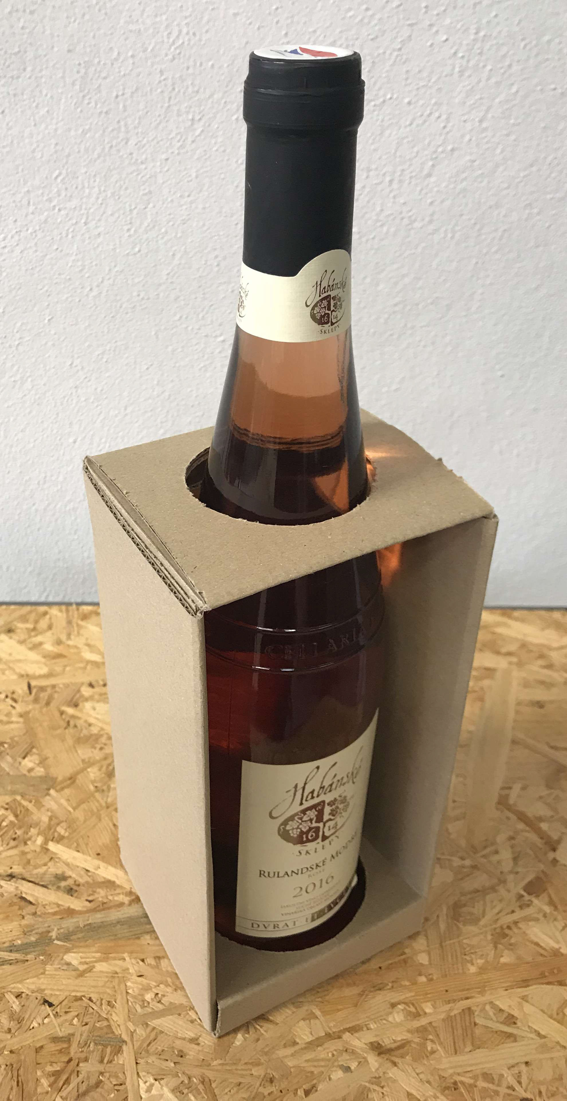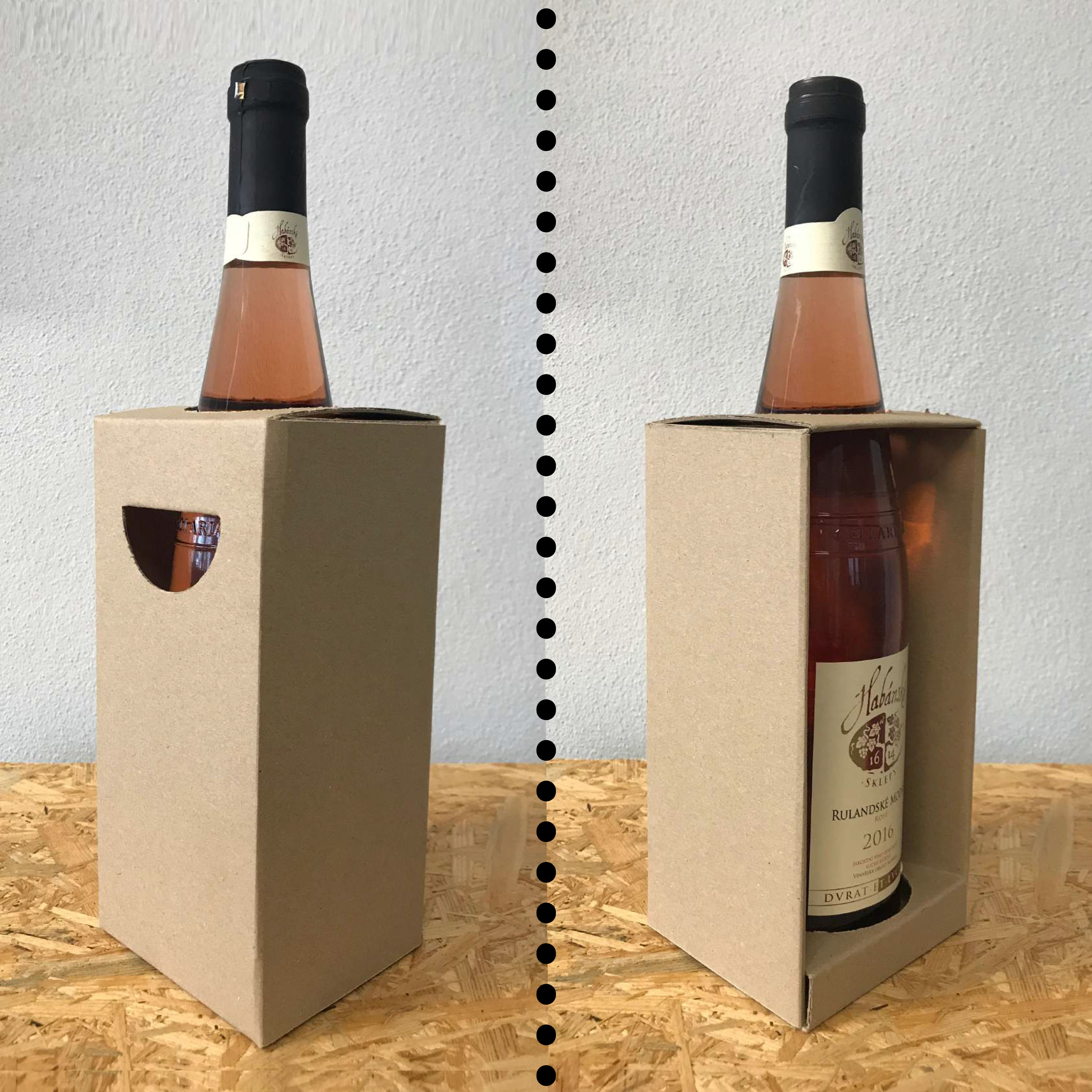 Cílem bylo vytvořit minimalistický obal na víno, který neruší samotný design lahve. Obal je vytvořen bez lepených spojů a má výřez pro ucopení.