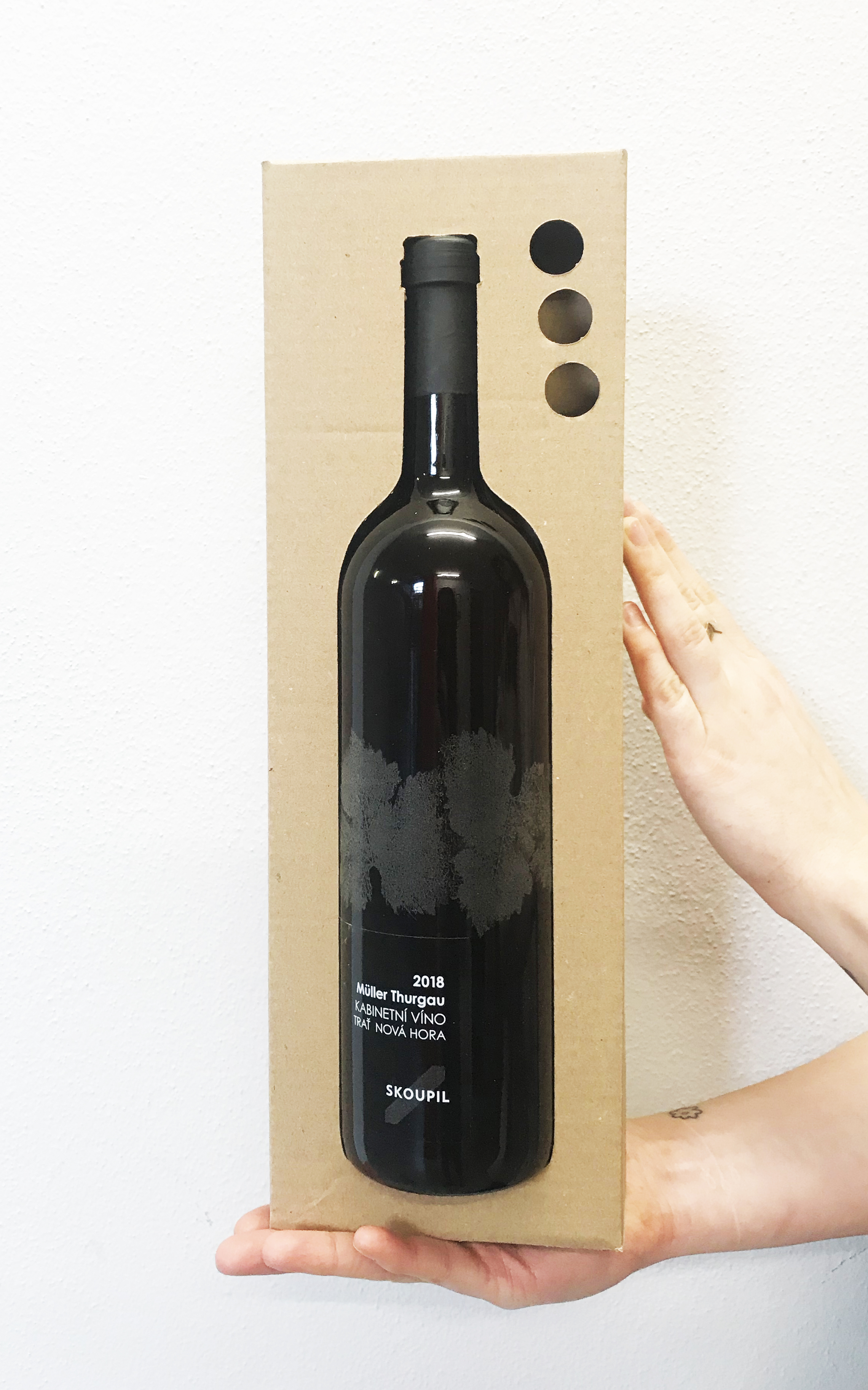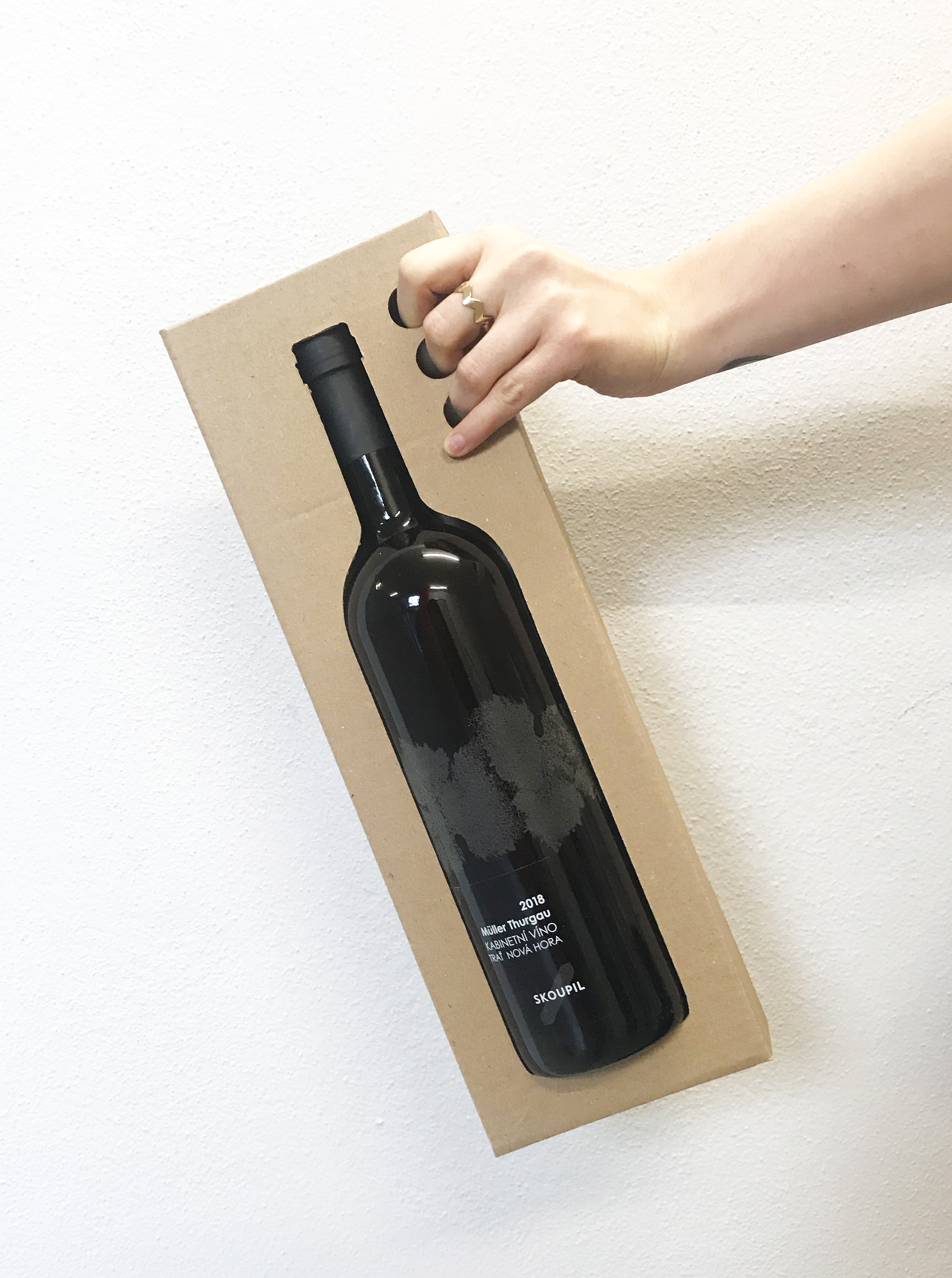 Jednoduchý, minimalistický dizajn obalu na víno skladá sa z jednej časti lepenky, bez lepenia. Úchyt obalu je vtipne vyriešení troma otvormi na prsty.