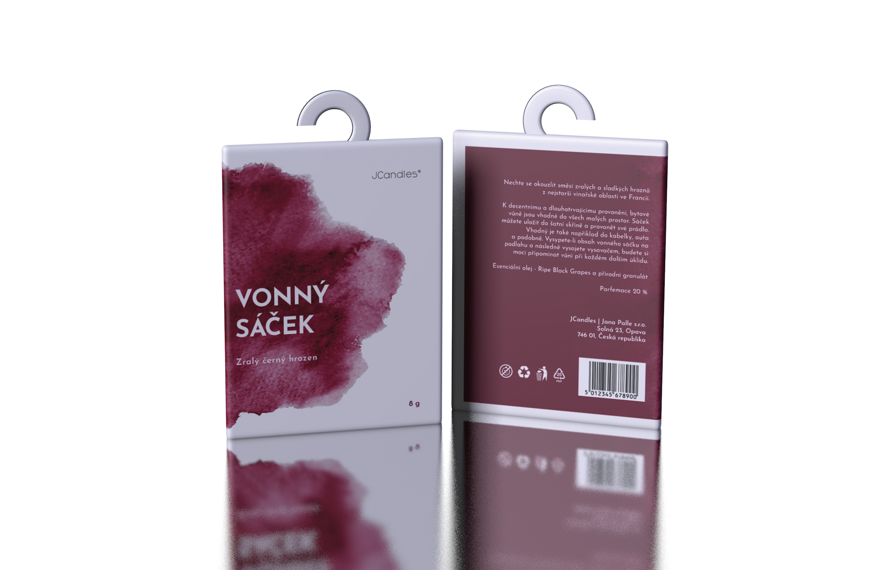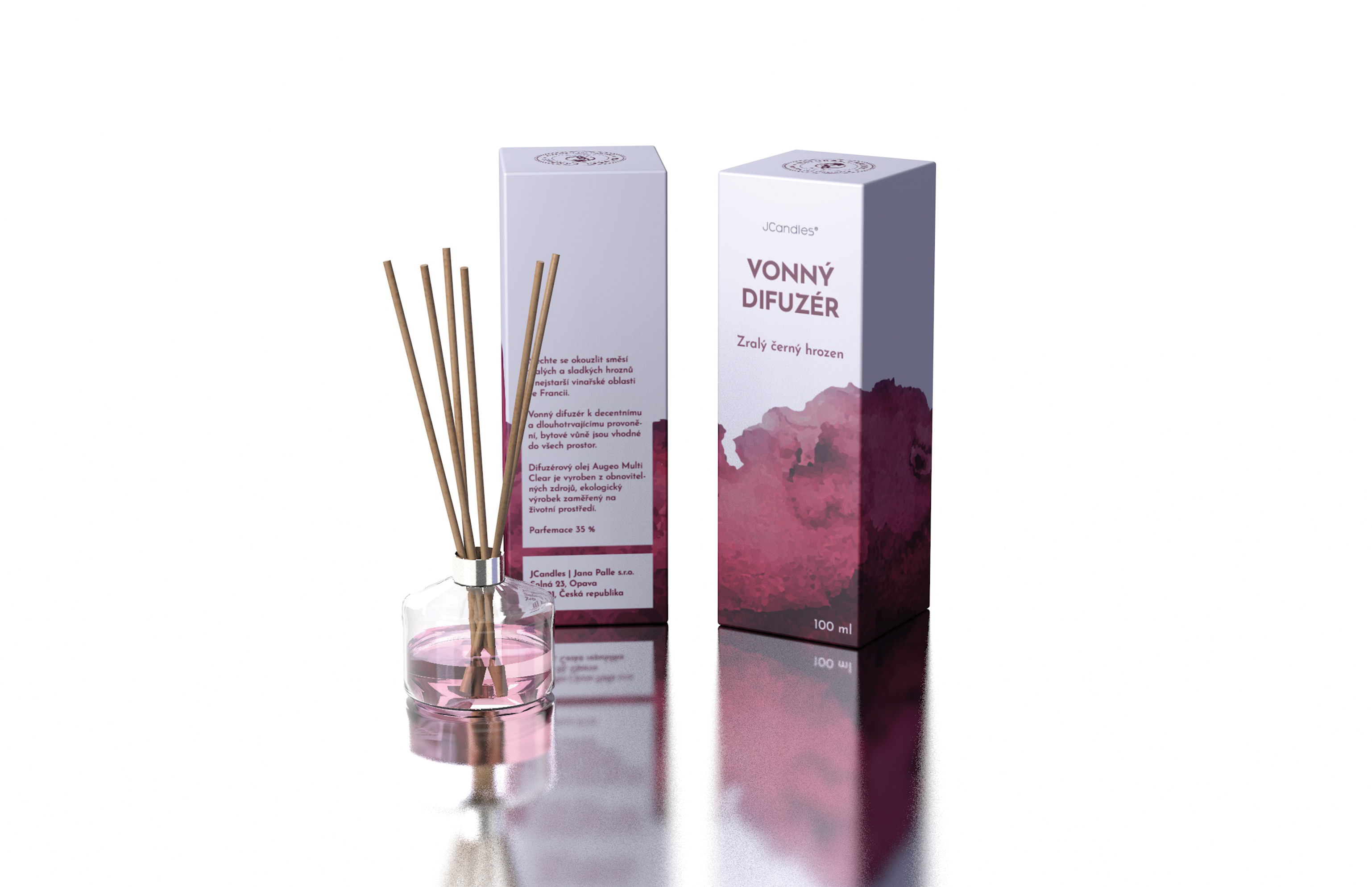 Mým cílem bylo navrhnout redesign obalů na vonné vinné produkty od firmy JCandles. Konkrétně jsem si vybrala vonný difuzér a vonný sáček s vůní zralých černých hroznů. Ústředním motivem jsou vínové akvarelové fleky, které mají