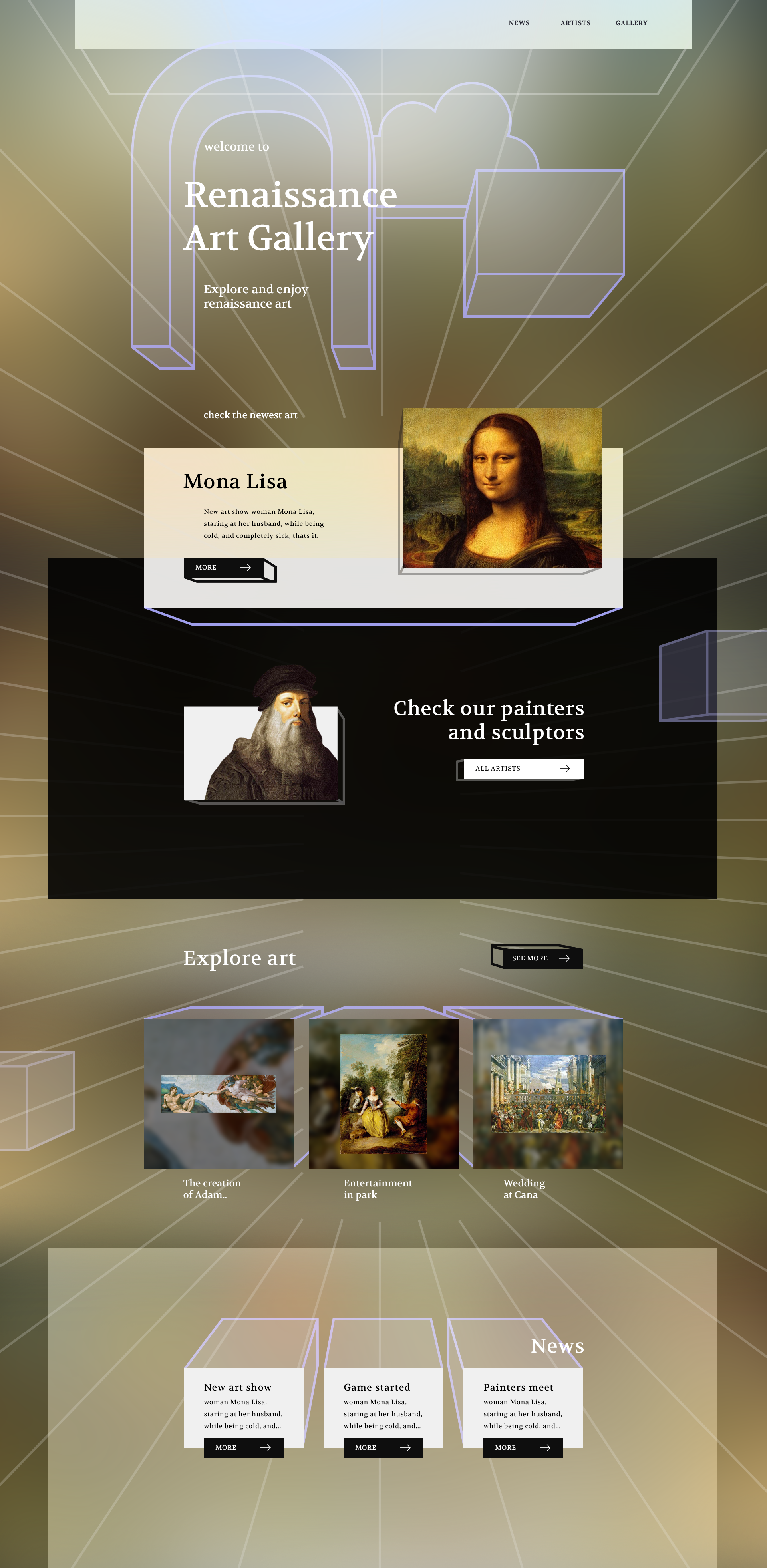 Vytvořil jsem Online galerií/portfolio renesančních umělců, pro jejich dobovou prezentaci. Pracoval jsem hodně s persperktivou, která renesanci zasáhla. Persperktivu můžeme najít v opravdu mnoha obrazech, proto layoutem webu jsou osy persperktivy na které se připojují prvky, jako kdyby web kreslili renesanční umělci.