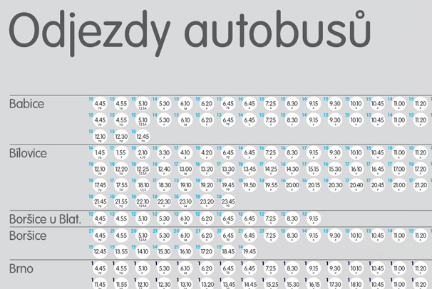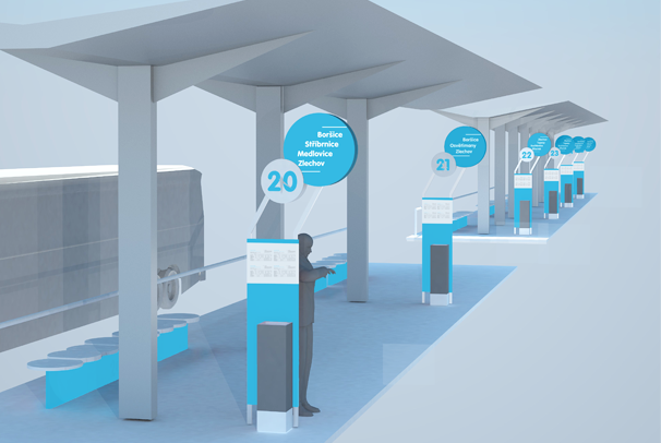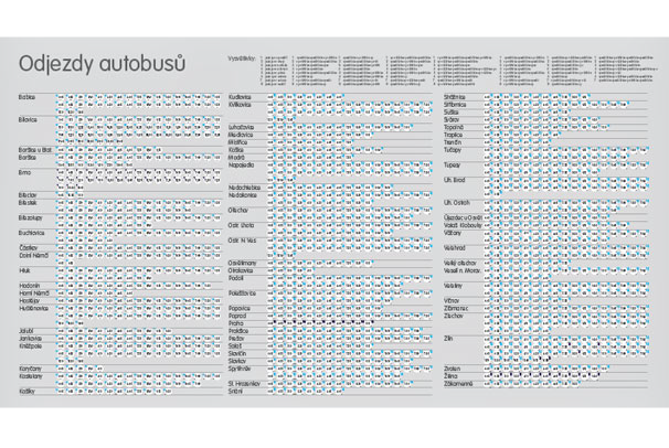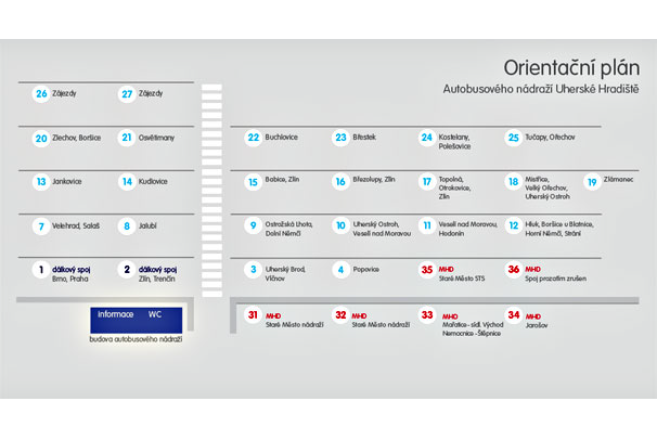 Vytvoření grafiky pro informační systém autobusového nádraží Uherské Hradiště. Hlavním cílem naší snahy bylo zpřehlednit a zkompaktnit celkový systém dopravy a dopřát lidem příjemnější a odlehčenější výraz designu informací na tomto rušném místě.