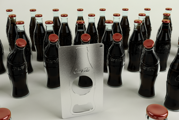 Řešení kapesního otvíráku ve stylu kreditní karty. Tento otvírák umožňuje otevřít veškeré produkty společnosti Coca Cola.