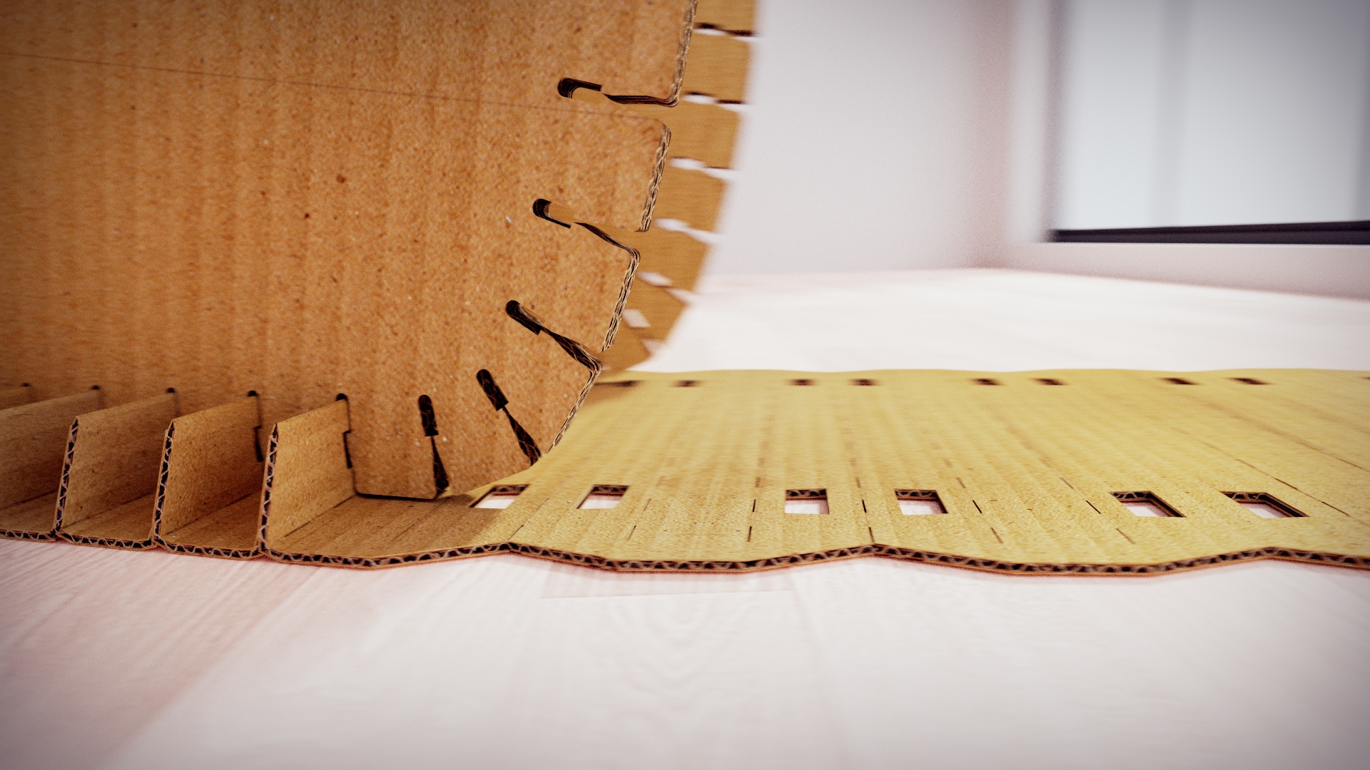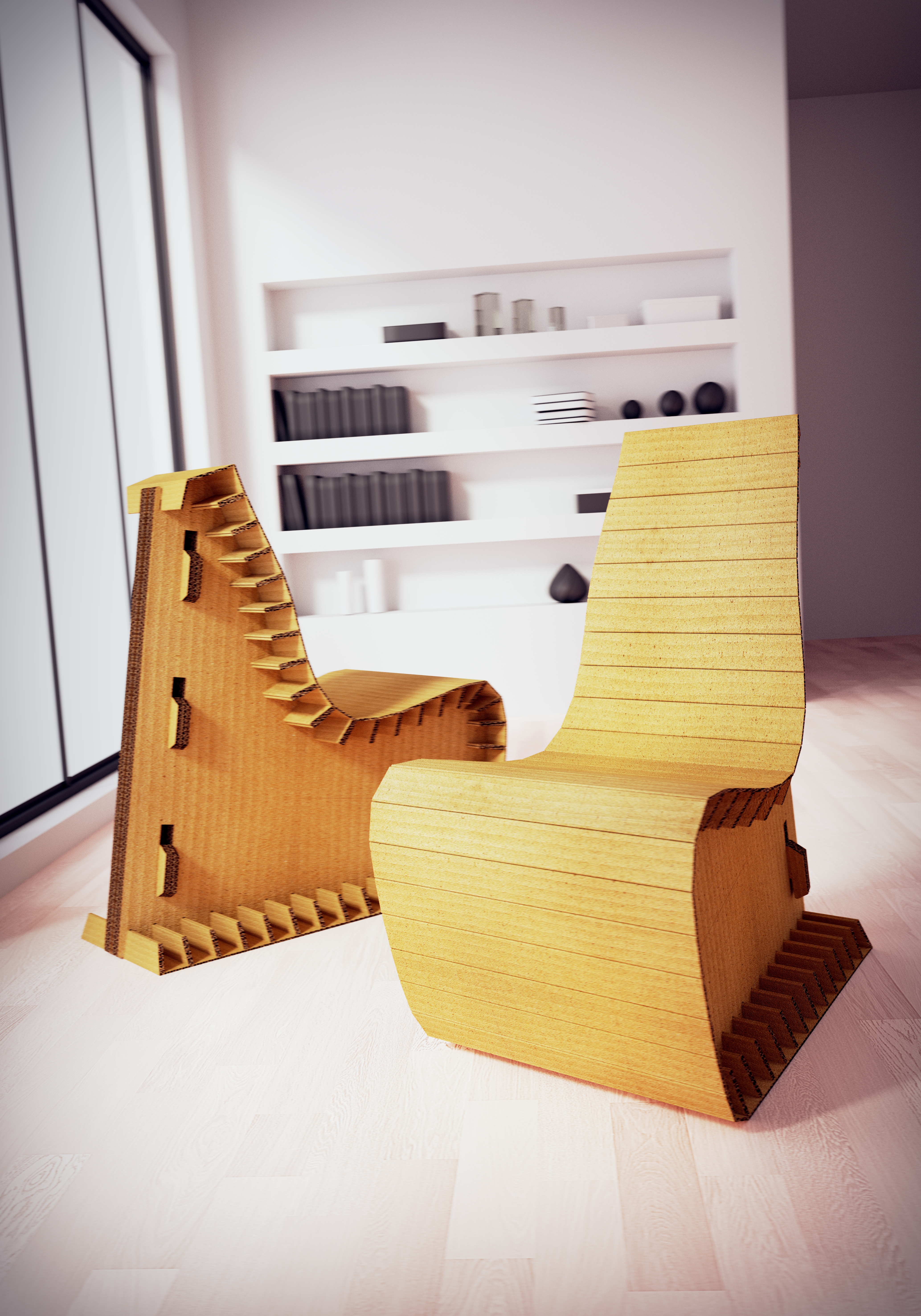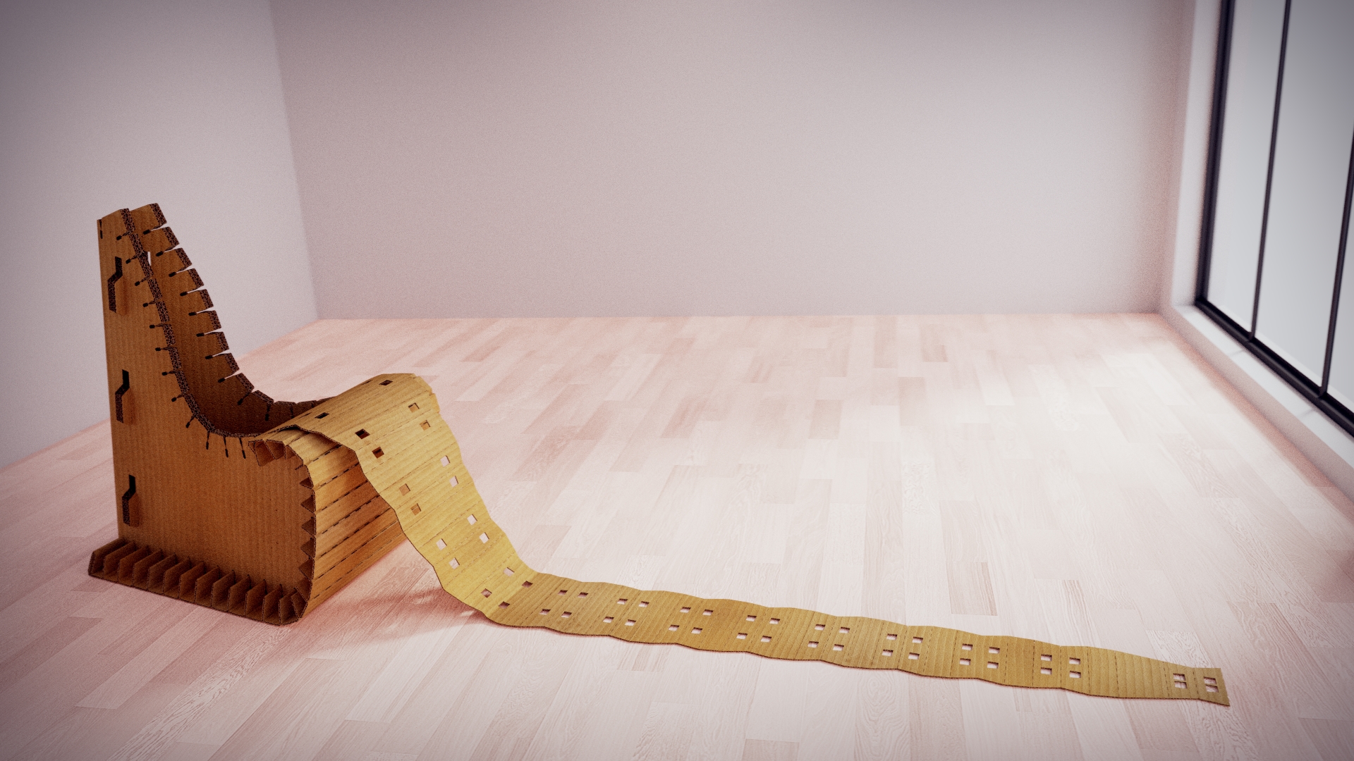Návrh papírového křesla z vlnité lepenky složeného pouze ze čtyř dílů.