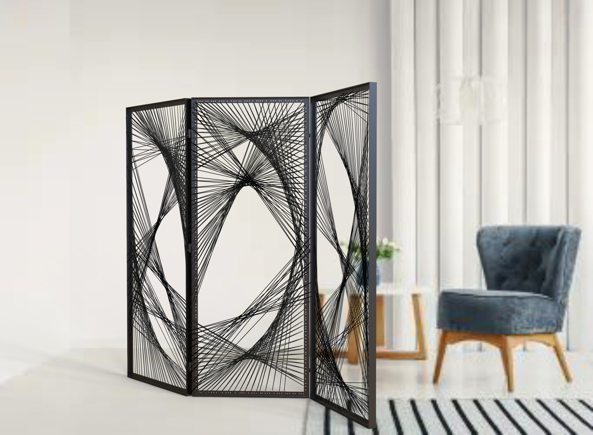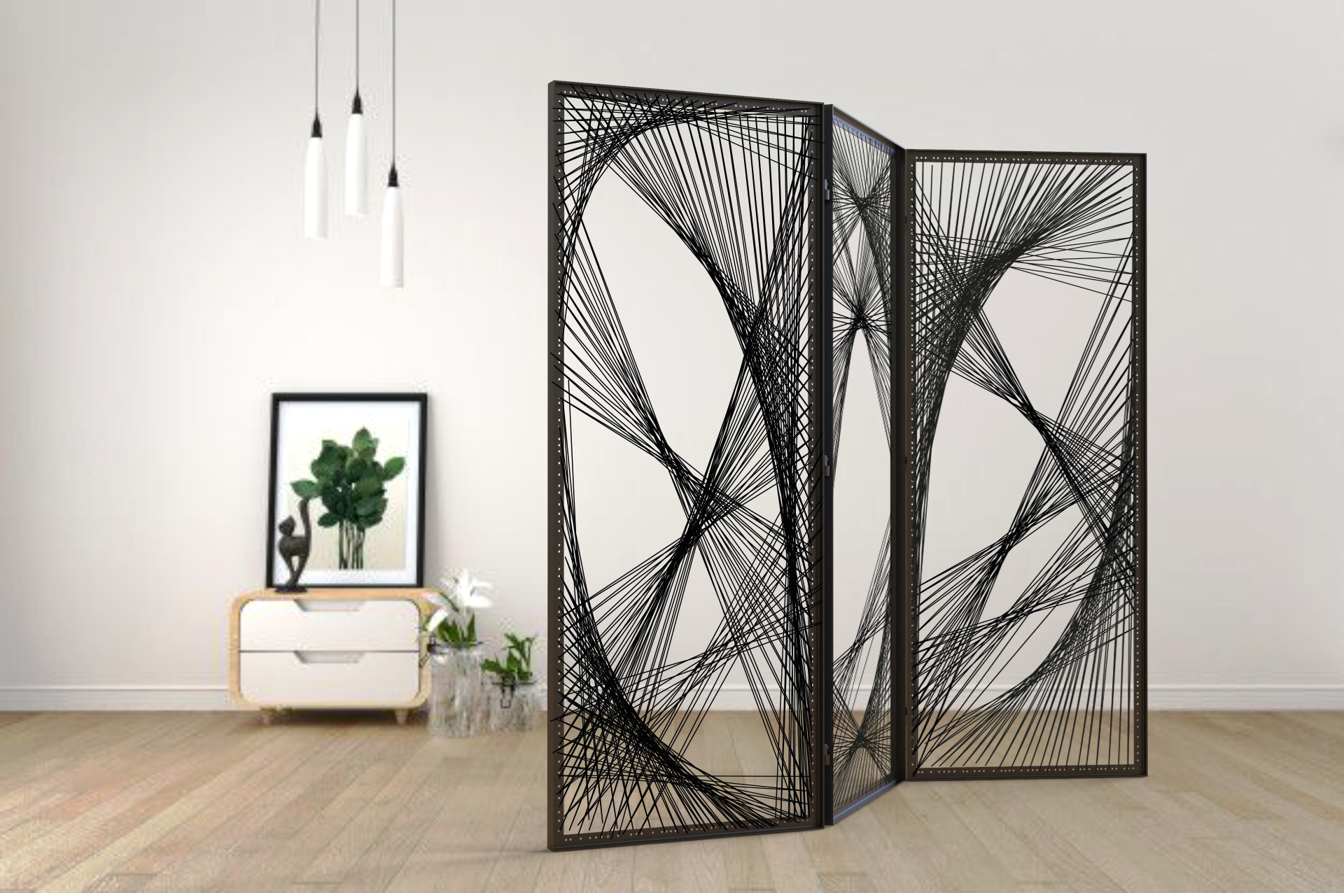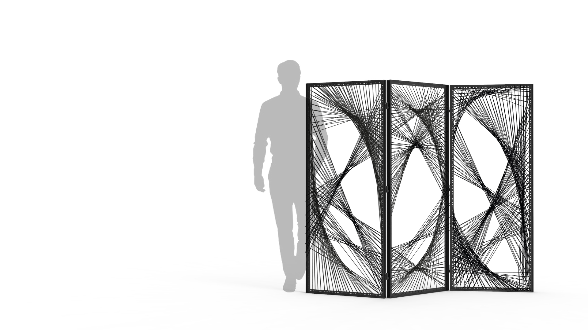 Paraván je inspirovaný String artem, kostra je svařená z ocelových T profilů s otvory, pro proplétání nylonového lanka.