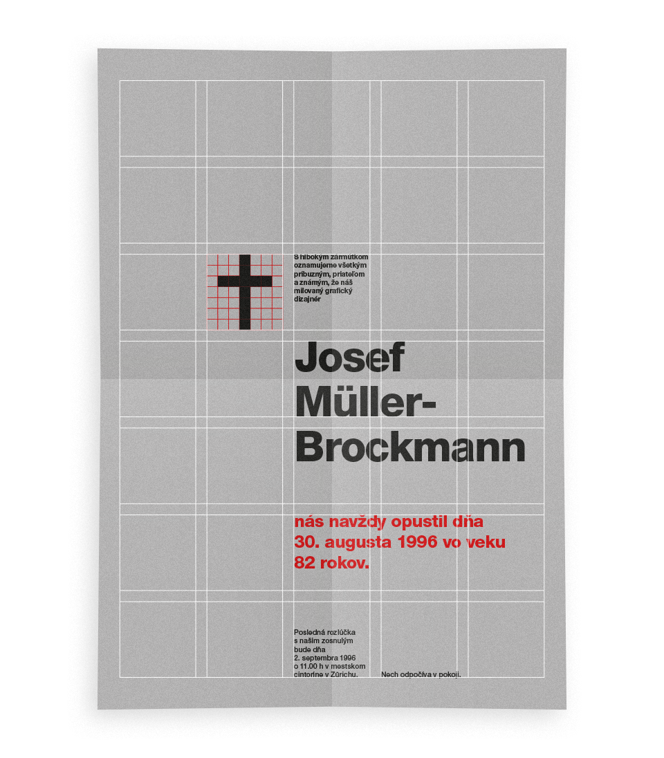Parte osobnosti a grafika Josefa Müller-Brockmanna vytvorené technikou použitia gridu, ktorá patrí k jeho najvýznamnejším prínosom pre grafický dizajn. Parte je zároveň doplnené o jednoduché sans-serifové písmo a typickú farebnosť pre jeho práce.
