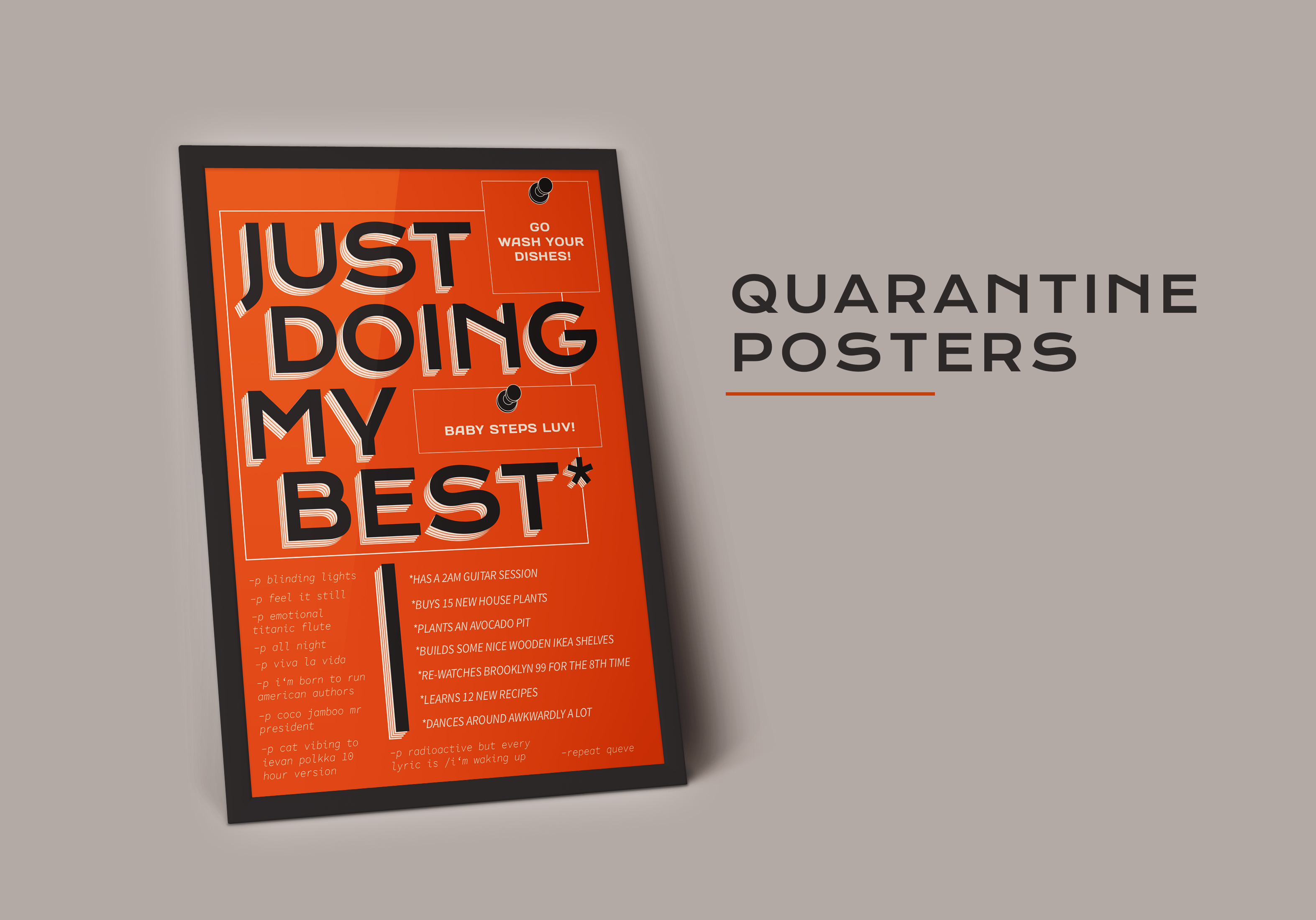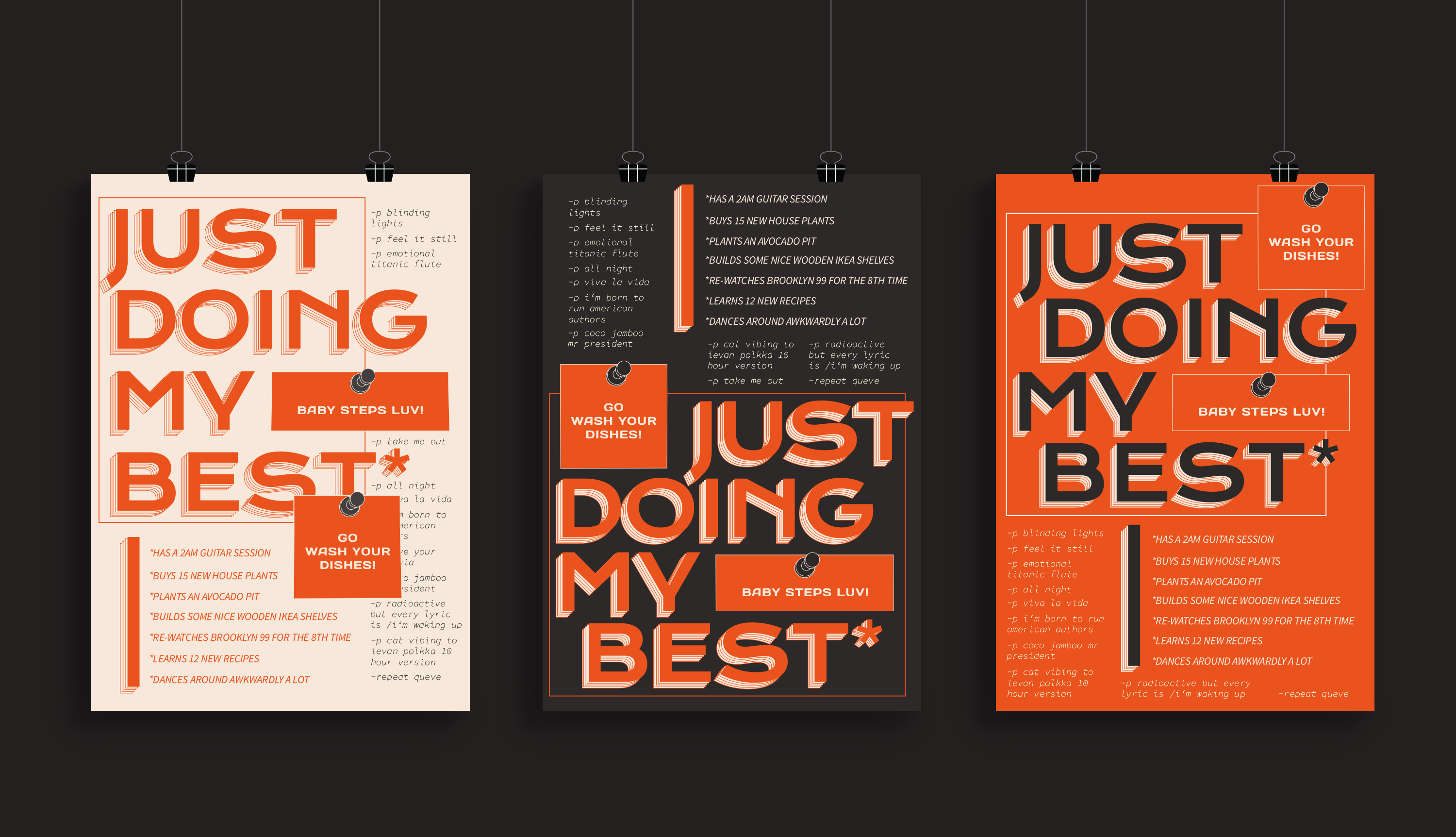 Pro sazbu více než třemi různými fonty jsem se rozhodla zpracovat něco jako svou karanténní nástěnku. Slogan Just doing my best, s nímž se asi po tolika měsících dokážeme ztotožnit snad všichni, doprovází připomínky, které mám na nástěnce i ve skutečnosti. Na poster jsem doplnila písničky, jimiž si krátím dlouhá rána, poledne a večery a obohatila ho i o zákulisní pohled na to, čím se snažím zachovat si svůj zdravý rozum.