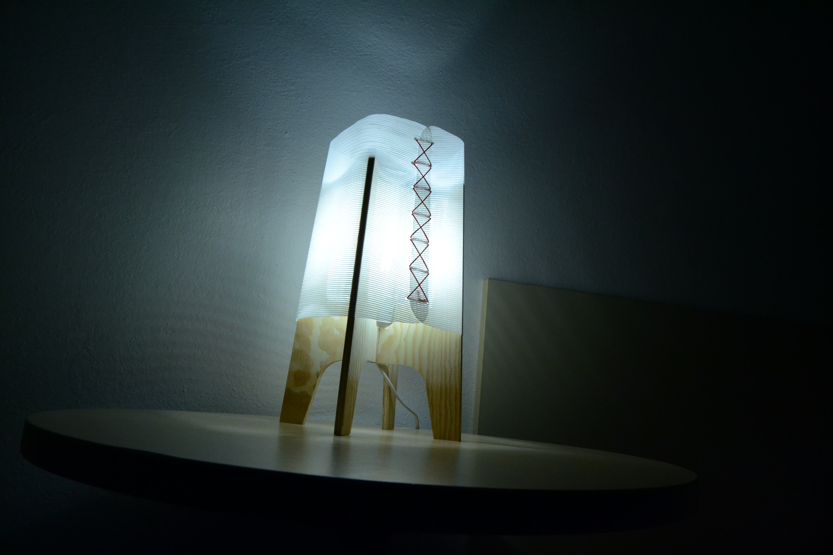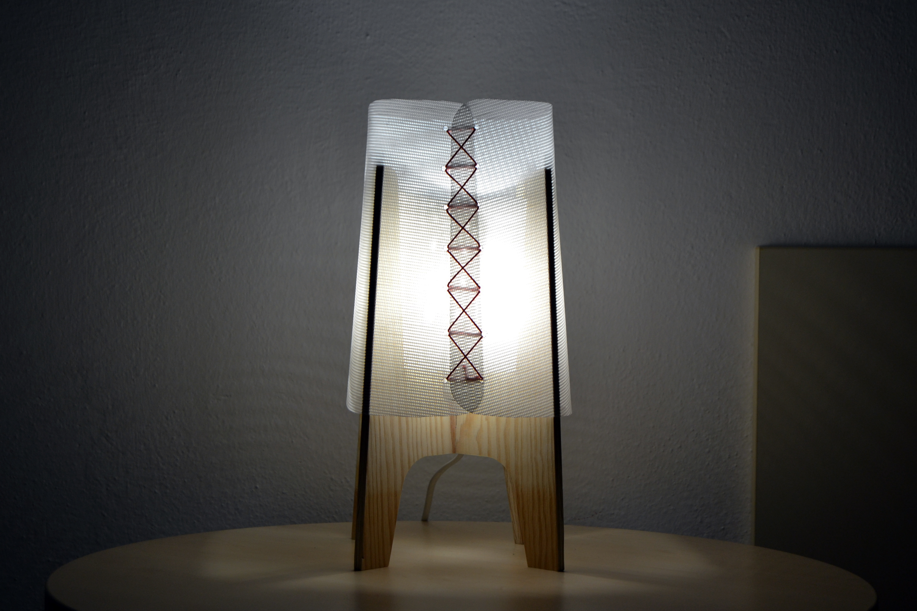 Lampa založena na jednoduchém skládání a kombinaci materiálů. Je složena z překližkových kusů zasunutých do sebe a dvou stínících část ze síťoviny, která se běžně používá v reklamních studiích na billboardy.