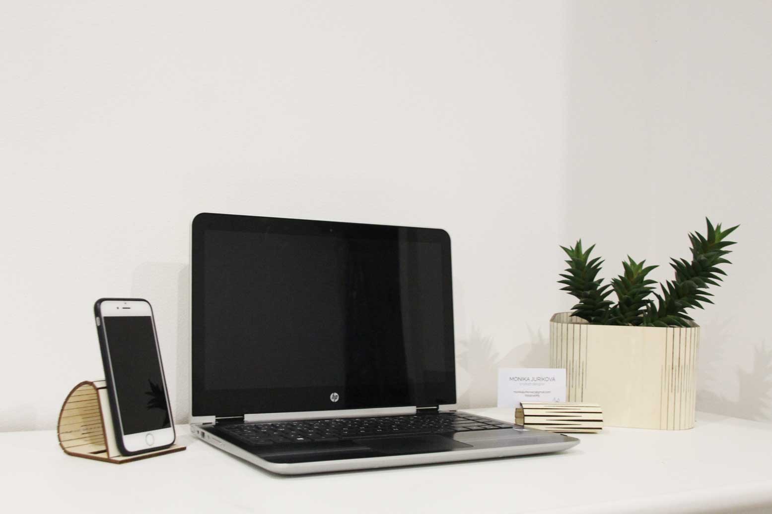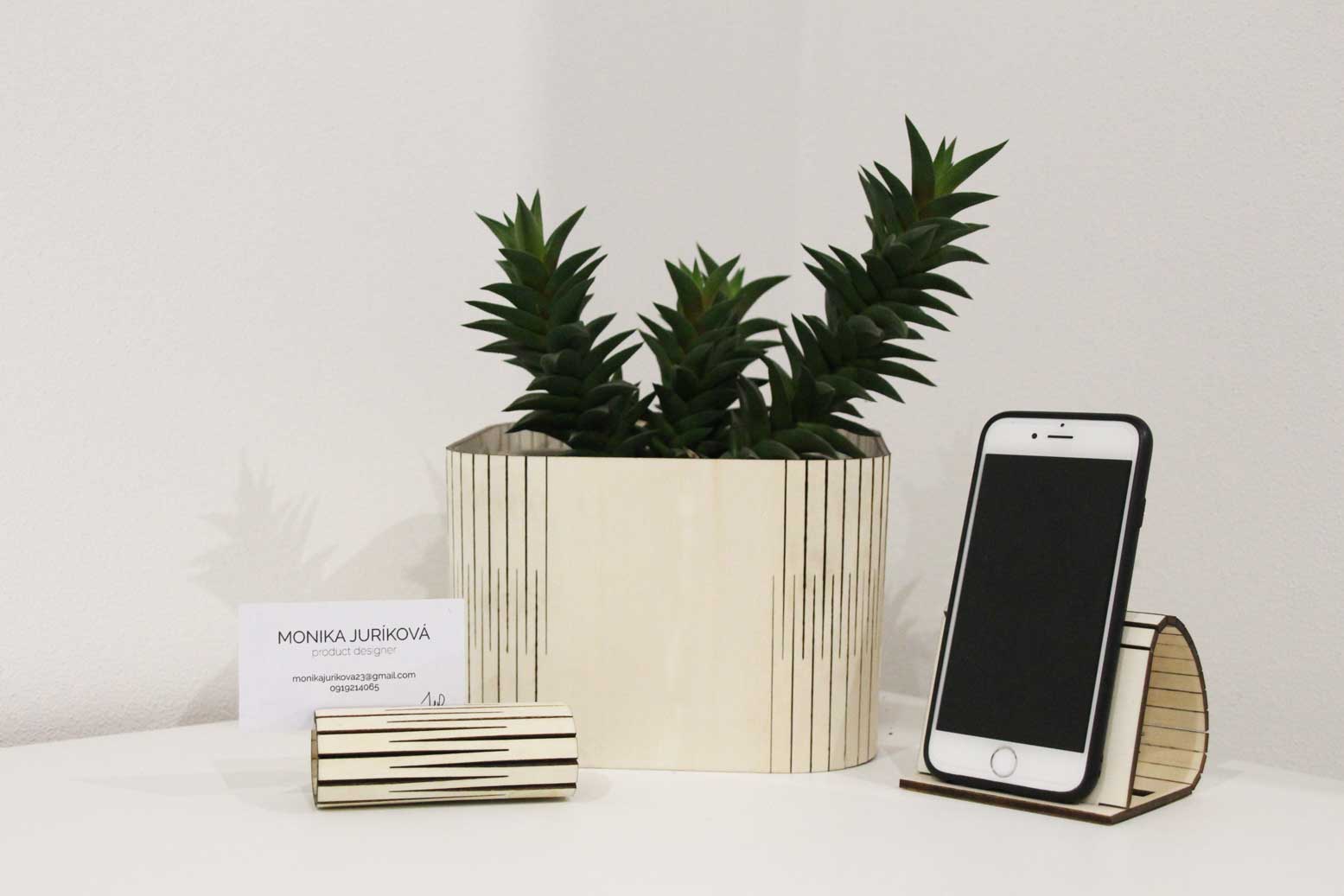 Sada na kancelársky stôl, vytvorená z 4 mm preglejky s použitím laserového rezu. Obsahuje 4 predmety, stojan na vizitky, stojan na mobil, kvetináč a stojan na písacie potreby.
