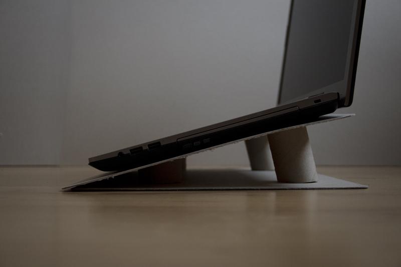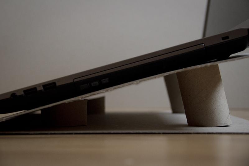 Podložka pro notebook, vyrobena z odpadového materiálu - ruliček od toaletního papíru a lepenky. Jelikož dvě ruličky unesou notebook o hmotnosti 3 kg, daly by se z ruliček dále vyrábět stolky a různé posezení.