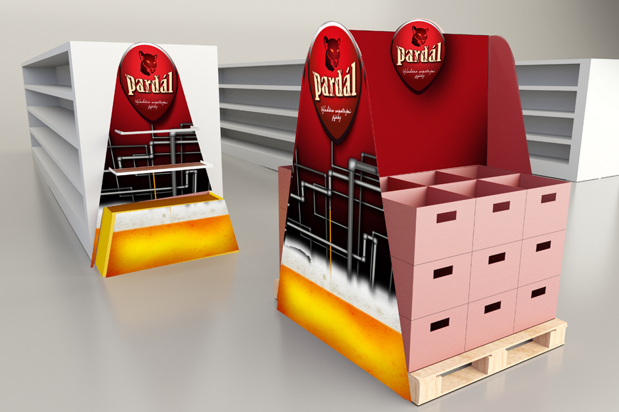P.O.P. regálový poutač, regálové čelo a paletový stojan pro pivo Pardál tvořeno grafikou z trubek, kde se míchá pivo. Magnetická plocha pro přidávání akčních letáků a plakátů