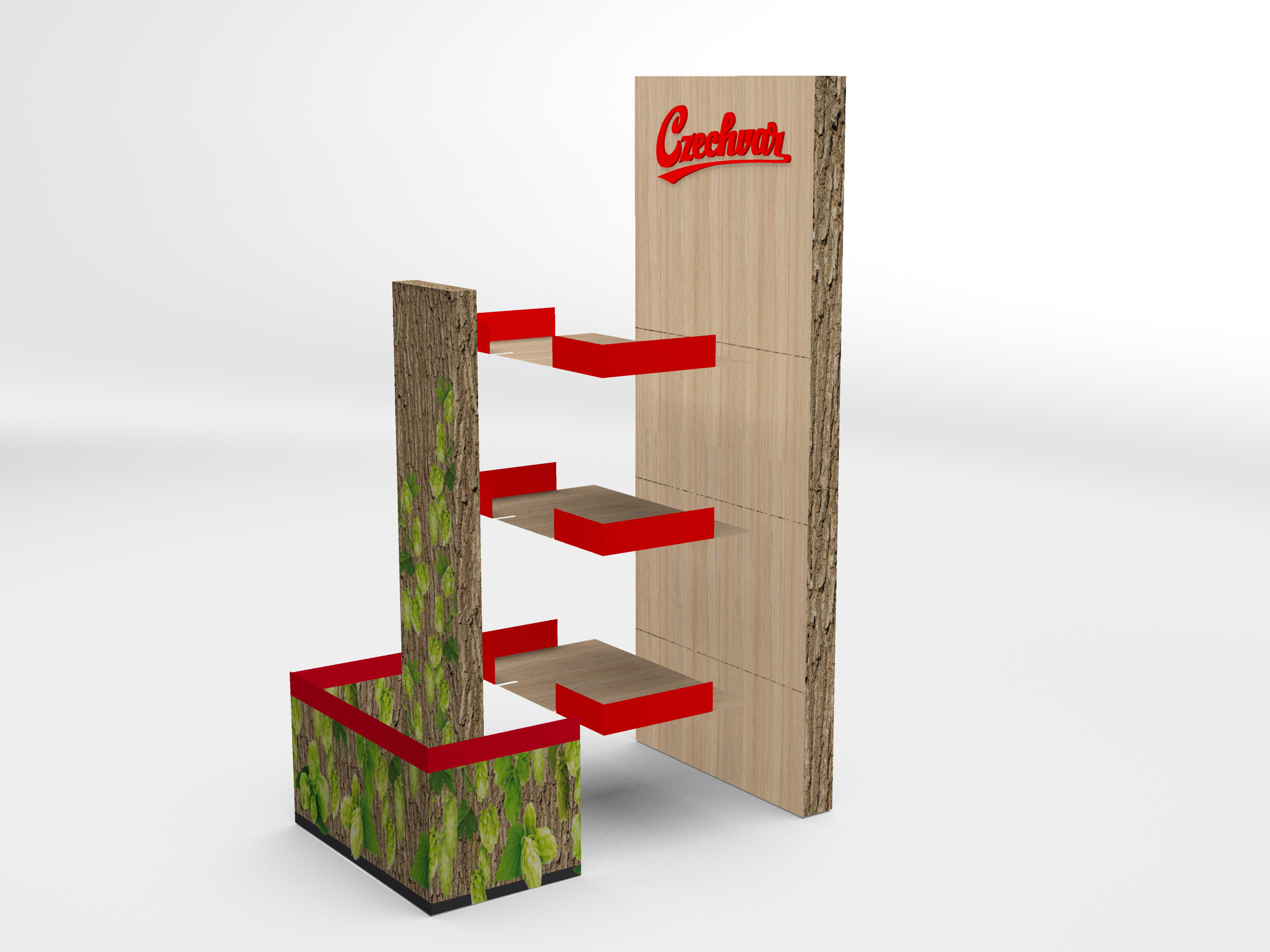 Dočasný výstavní stojan je inspirován dřevem. Při ručním opracování dřeva je potřeba poctivost, kterou se Czechvar pyšní. Vnější strany stojanu tvoří kůra, která představuje neopracovanou část, vnitřní poté již opracované dřevo. Chmel, kterým je stojan porostlý znázorňuje poctivost surovin. V horní části stojanu se nachází logo. Stojan je určen na 28ks plechovek, 28ks lahví a 6ks soudku.