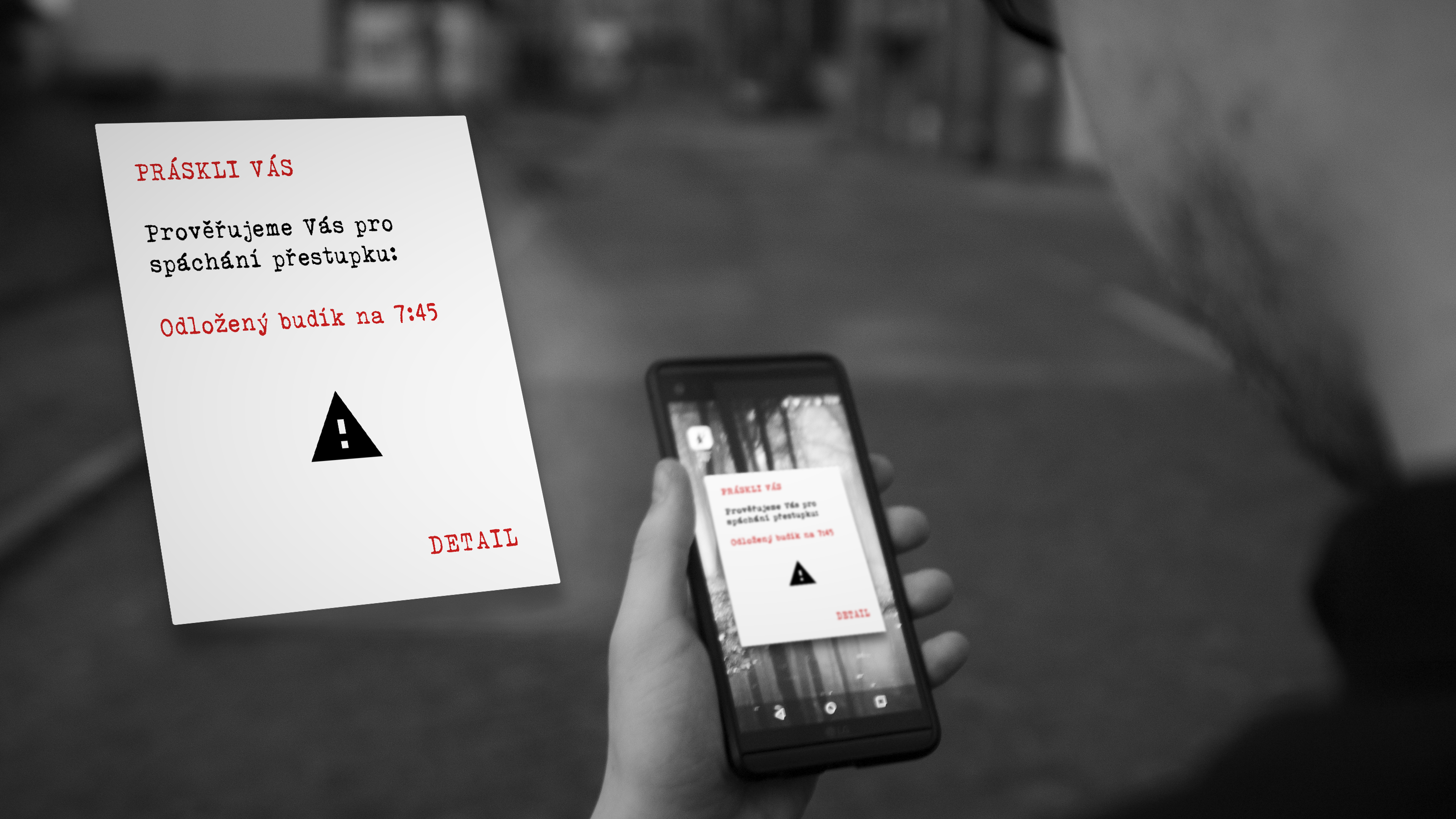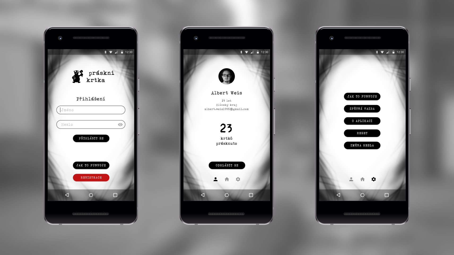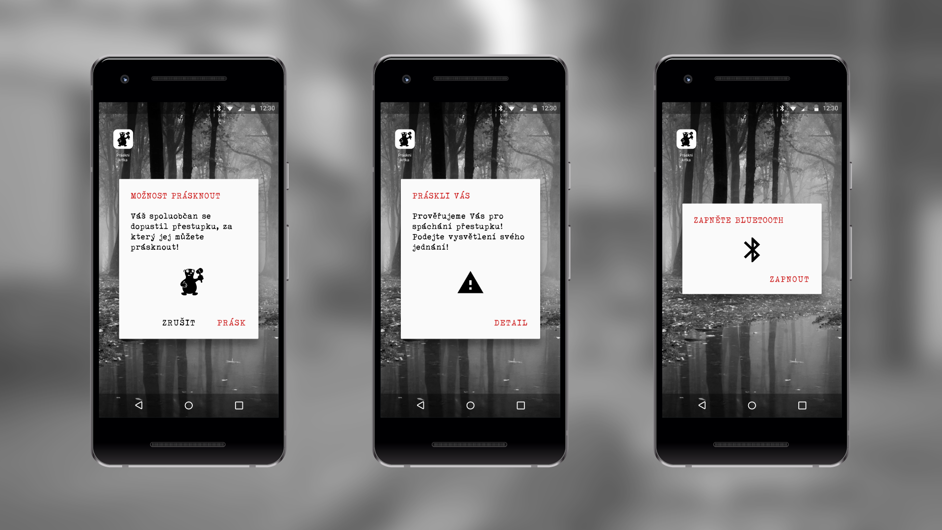 Koncept aplikace, která simuluje pocity strachu a nejistoty za éry komunismu. Soustředil jsem se konkrétně na „práskačství“, tedy udávání spoluobčanů. Název aplikace „Práskni krtka“ je modifikací názvu dětské hry „Plácni krtka“, při které hráč plácá krtky gumovou palicí. Krtek je v mém pojetí ten, který podrývá a podkopává systém a ukrývá se. Nainstalovaná aplikace si pamatuje, jakým způsobem používám telefon a vyhodnocuje „přestupky“. Tím může být např. odložený ranní budík. Pokud tedy ráno vstanu později, poté jdu do města a cestou potkám na ulici někoho s touto aplikací, proběhne anonymní předání informace o přestupku (pouze když se přiblížíme na dosah bluetooth) a dotyčný mě pak bude moci prásknout, protože mu přijde upozornění o mém přestupku. Já ale nevím, kdo mě práskl, a o svém přestupku se dozvím až zpětně. Ale co všechno aplikace vlastně sleduje? Kdo z těch lidí na ulici má aplikaci? Kdo o mně co ví? Mohu věřit vůbec někomu? Práce našla své místo na podzimní výstavě k 30. výročí Sametové revoluce.