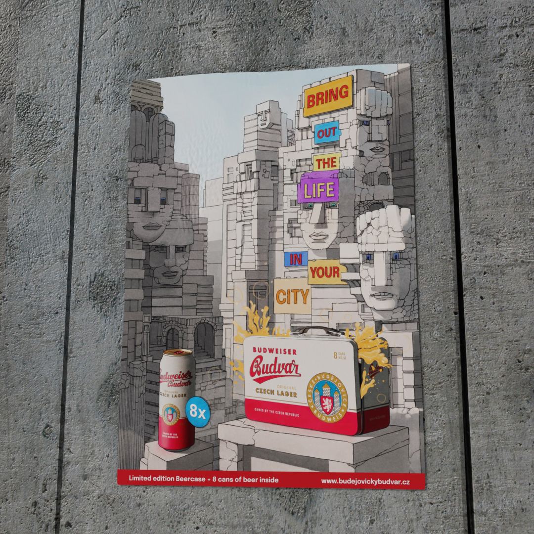 Reklamní plakát pro Budweiser Budvar. Pointou plakátu je naznačit kauzální vztah mezi pitím piva a pocitem štěstí/dobré nálady. Mám rád ilustraci tak ji cpu všude, but hey, it ain't honest but it's work.