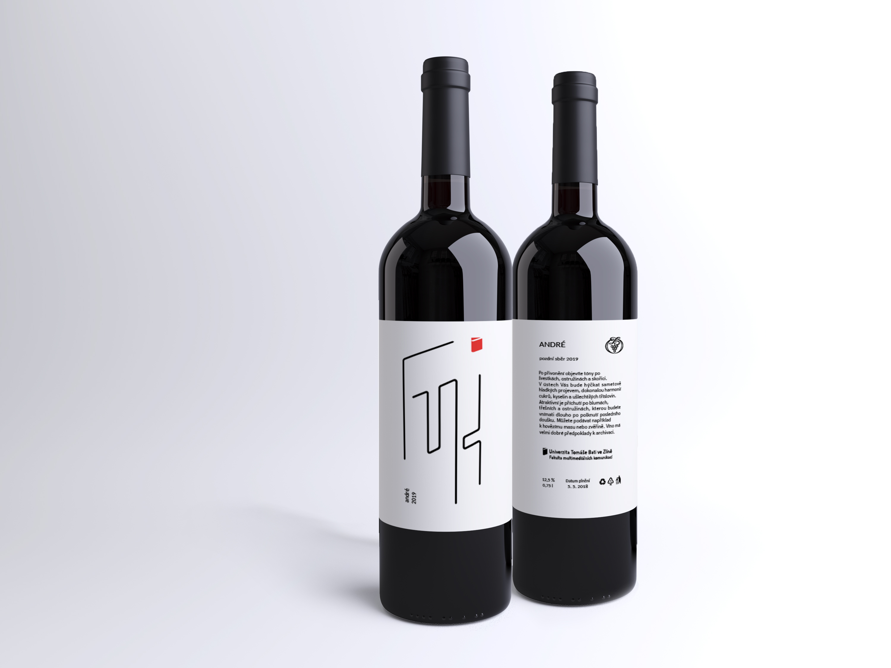 Návrh etiket na bílé a červené víno je vytvořený pro fakultu multimediálních komunikací. Výsledný produkt slouží fakultě jako dárkový předmět. Hlavním prvkem návrhu je zkratka fakulty s písmeny FMK.