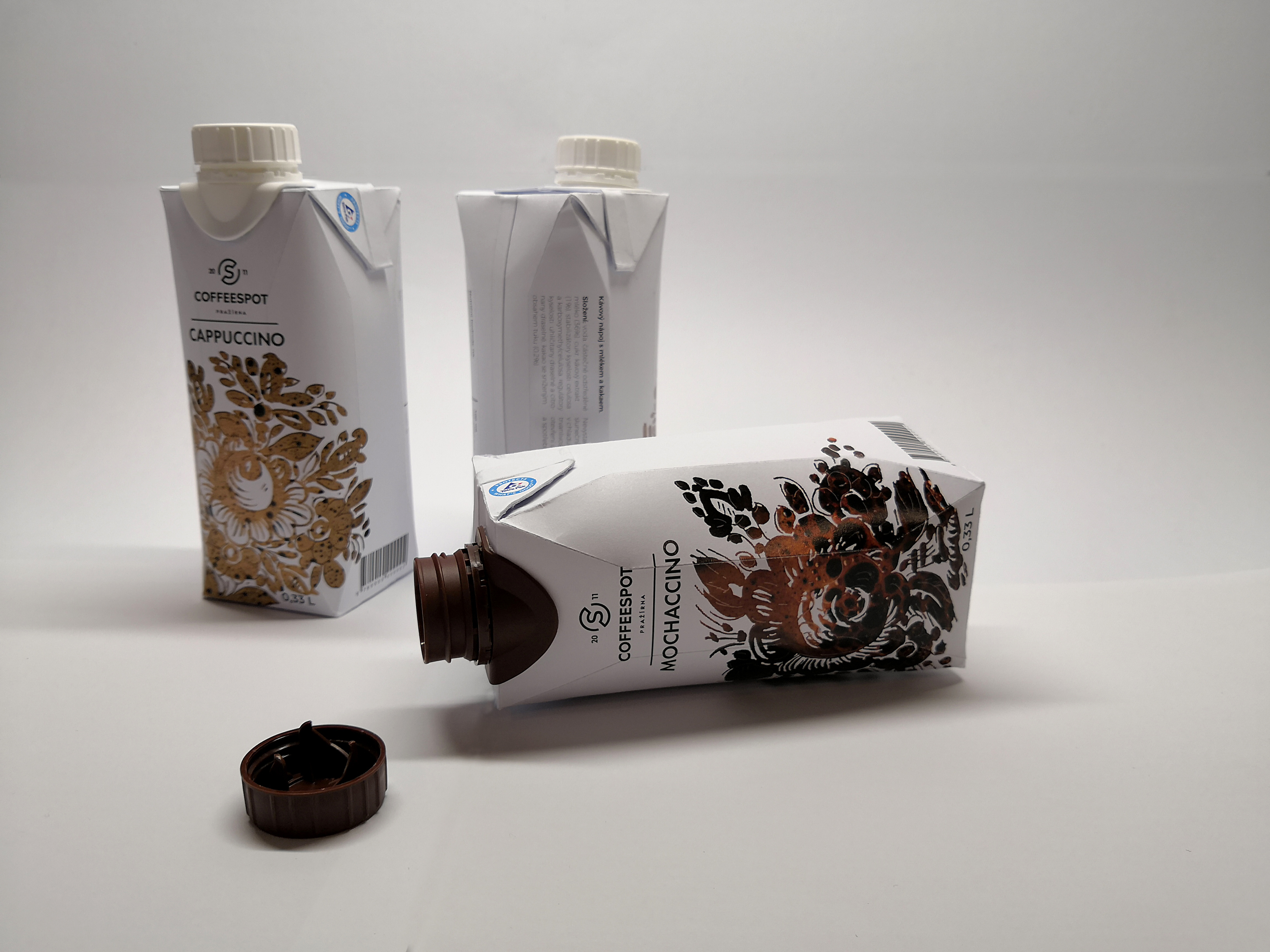 Sada tří tetrapack obalů na kafe s motivem tupeské keramiky.