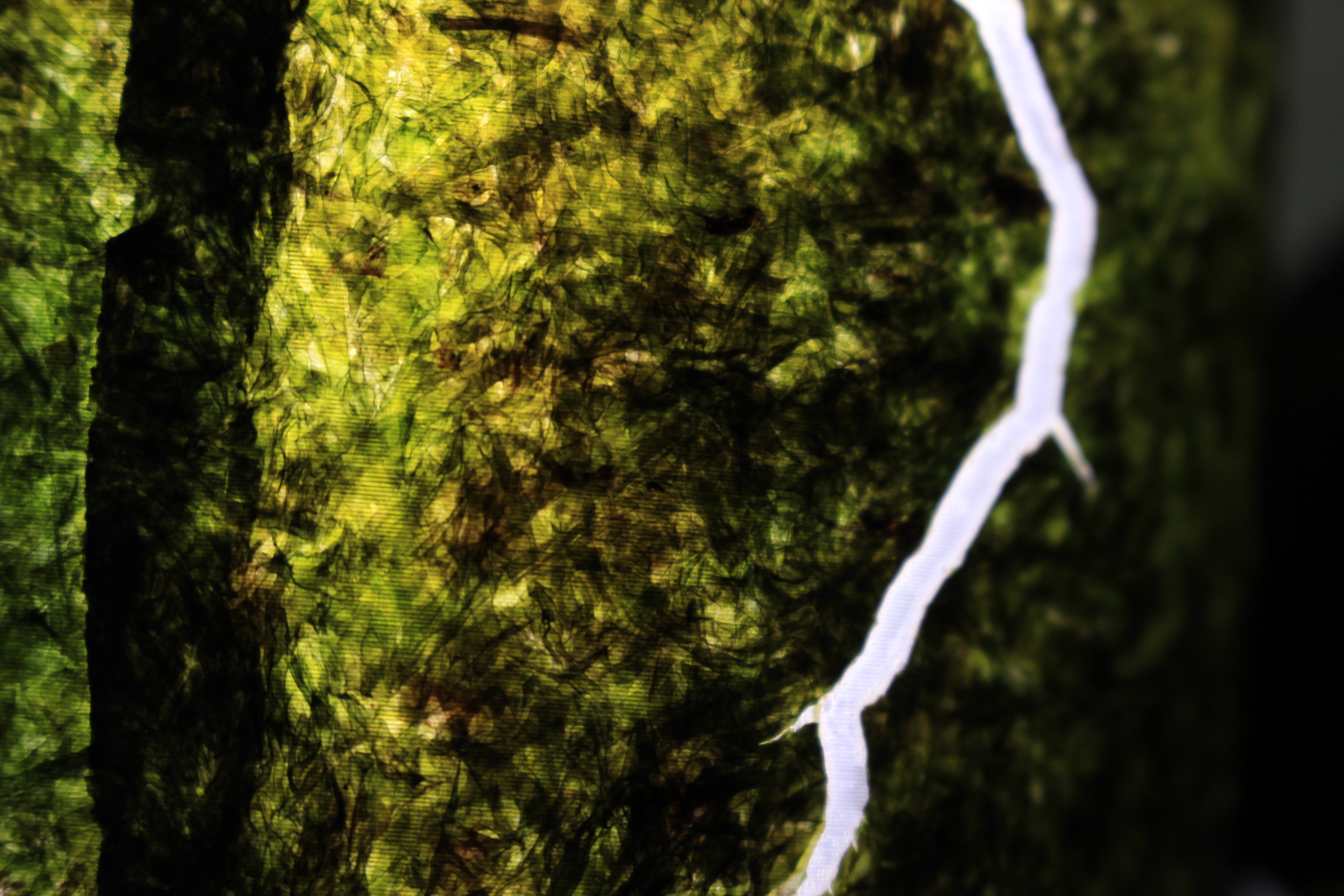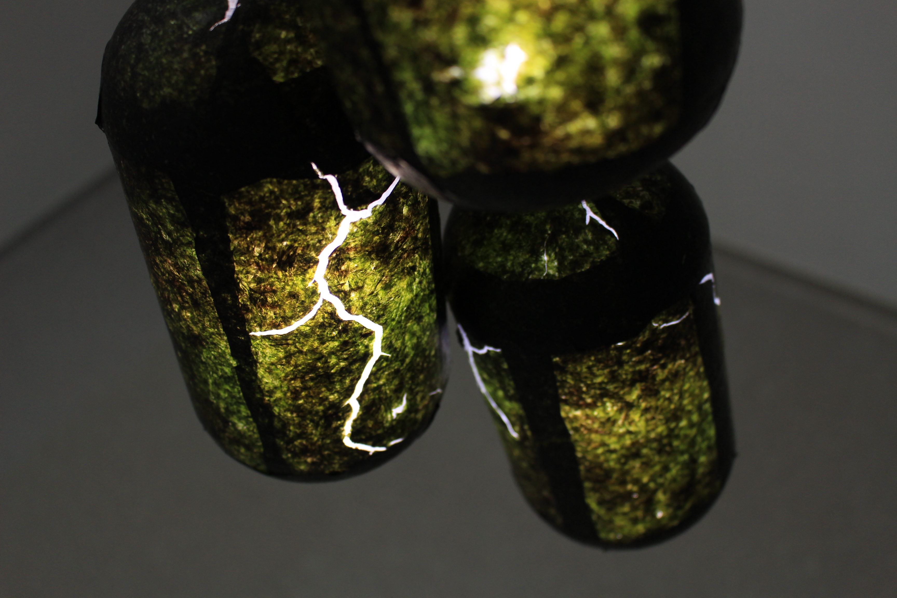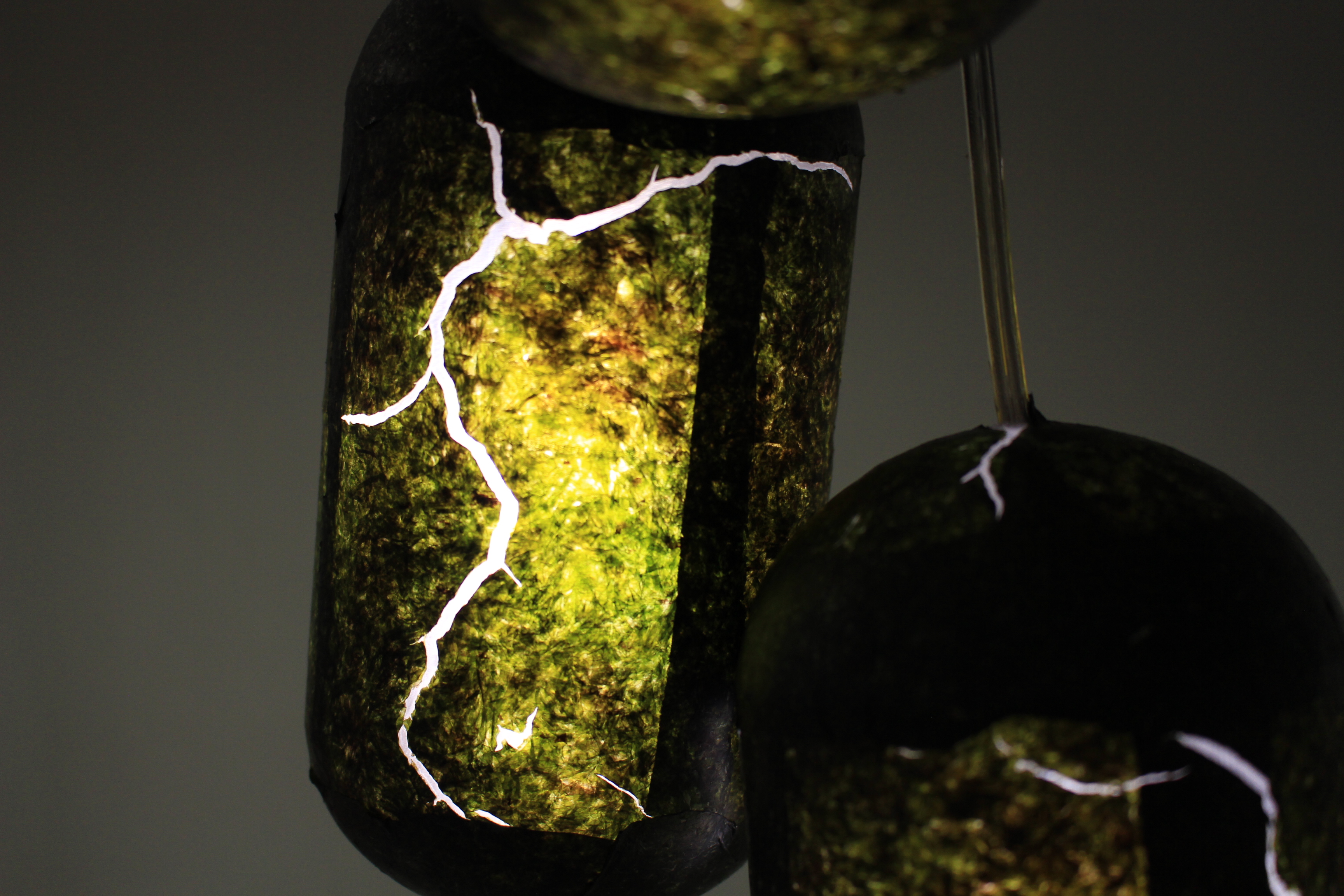 Ambientní svítidlo, které se skládá z 3D tiskových forem s nánosem plátů mořských řas. Řasy jsem nechala přirozeně uschnout a neovlivňovala jejich narušení povrchu. Praskliny propouští více světla a doplňují texturu.