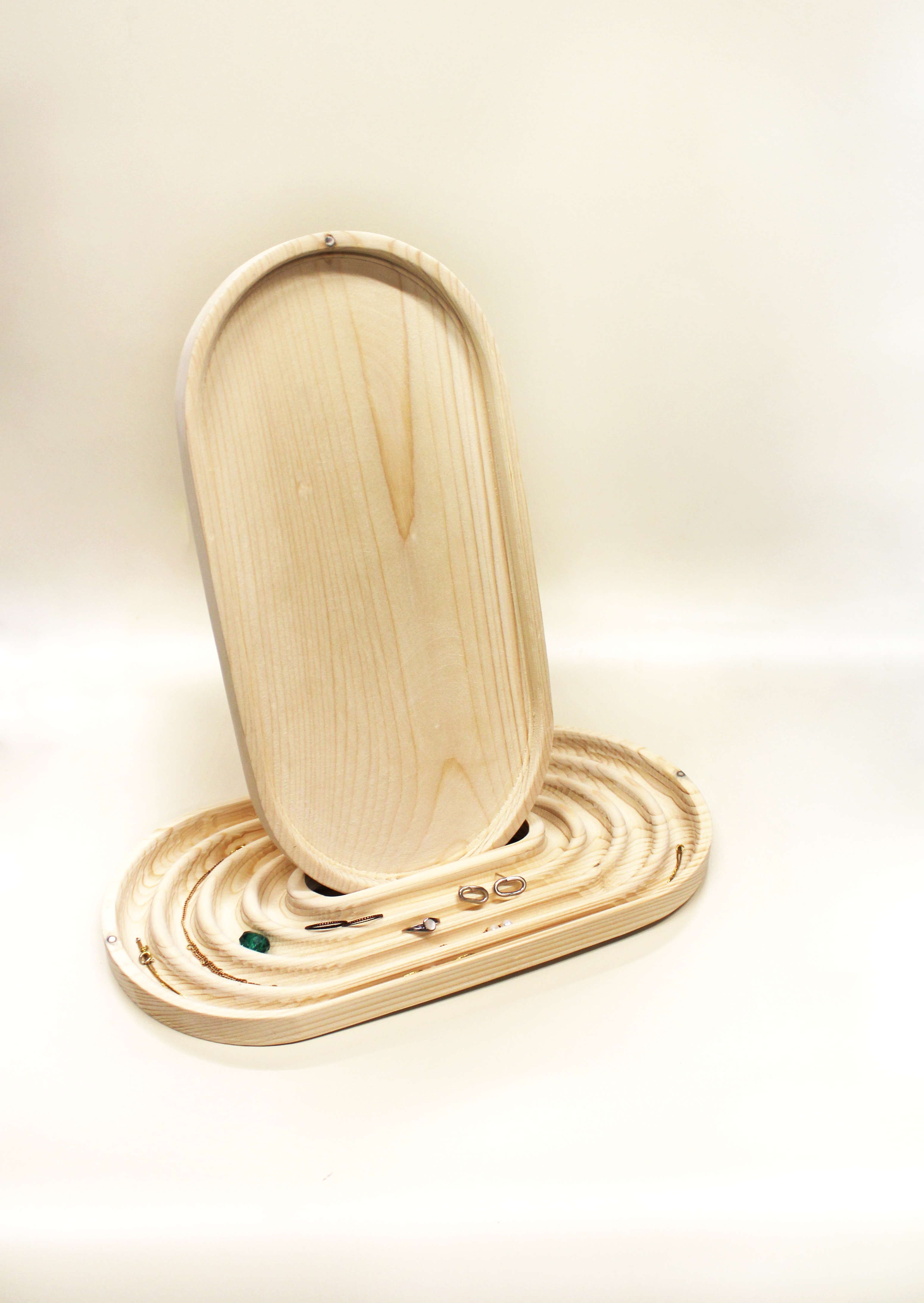 Šperkovnica vznikla pomocou techniky frézovania do dreva a skladá sa z dvoch častí. Spodná časť sa podobá na pretekársku dráhu, na ktorej vznikajú vlny, ktoré vytvárajú priestor pre šperky. Náhrdelníky a retiazky sa dajú uložiť pozdĺž celej dĺžky, prstene alebo náušnice je následne možné oprieť o vlnky. Spodná časť taktiež obsahuje otvor uprostred šperkovnice, do ktorého zapadá druhá časť - vrchnák - doň je vsadené zrkadlo. Obe časti sú spojené magnetmi.