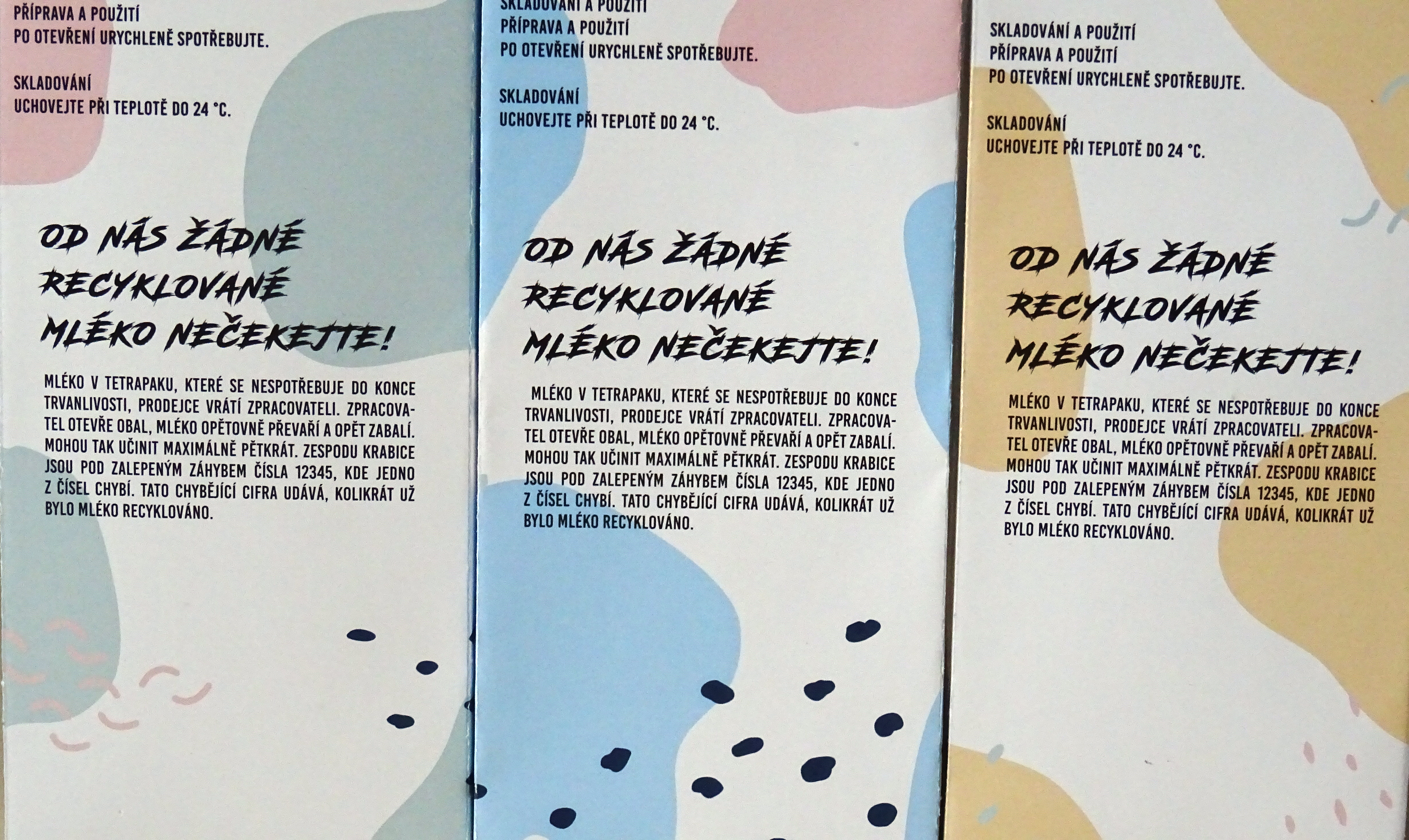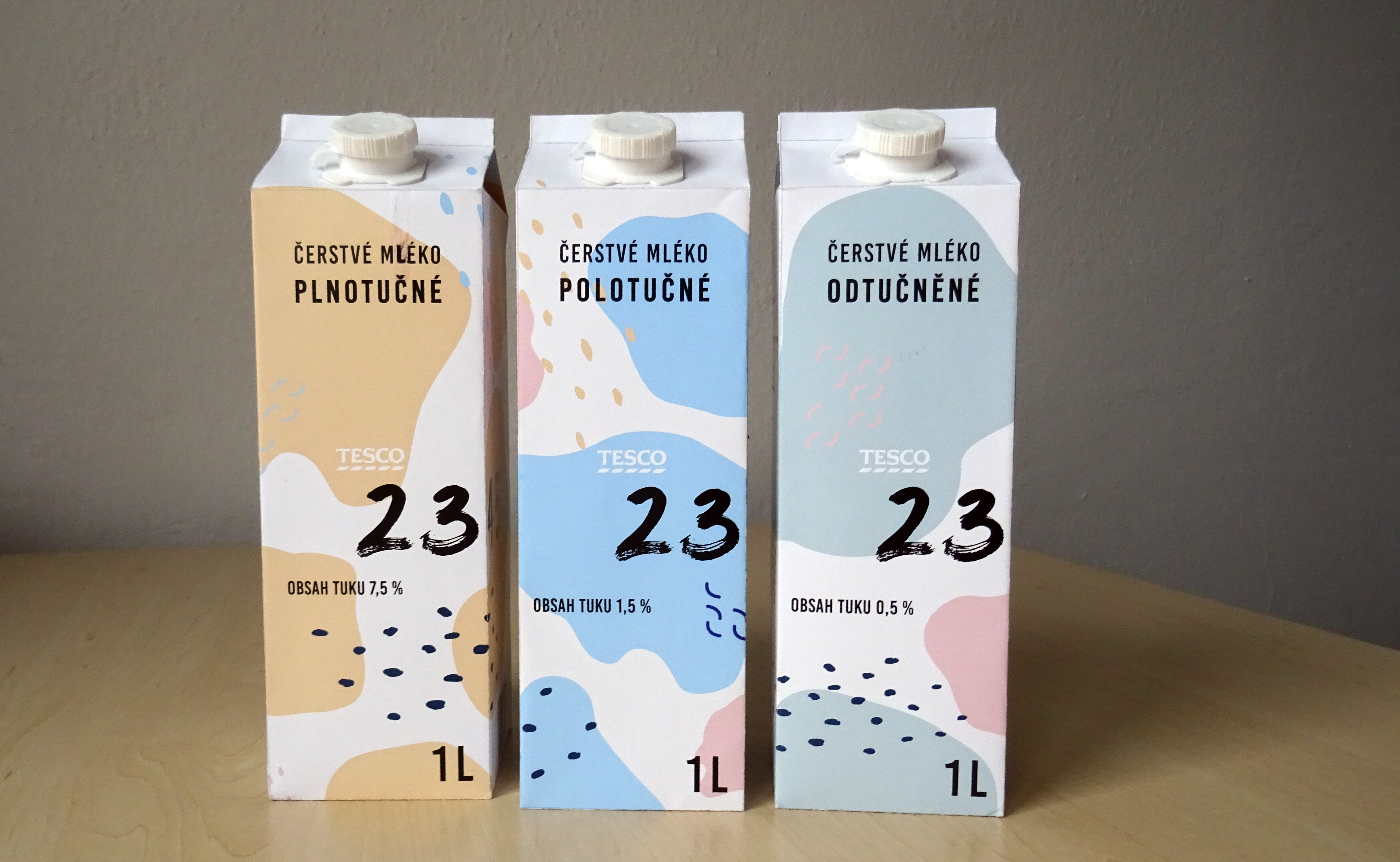 Série tetrapak obalů na čerstvé mléko podle typu mléka (plnotučné, polotučné a odtučněné).