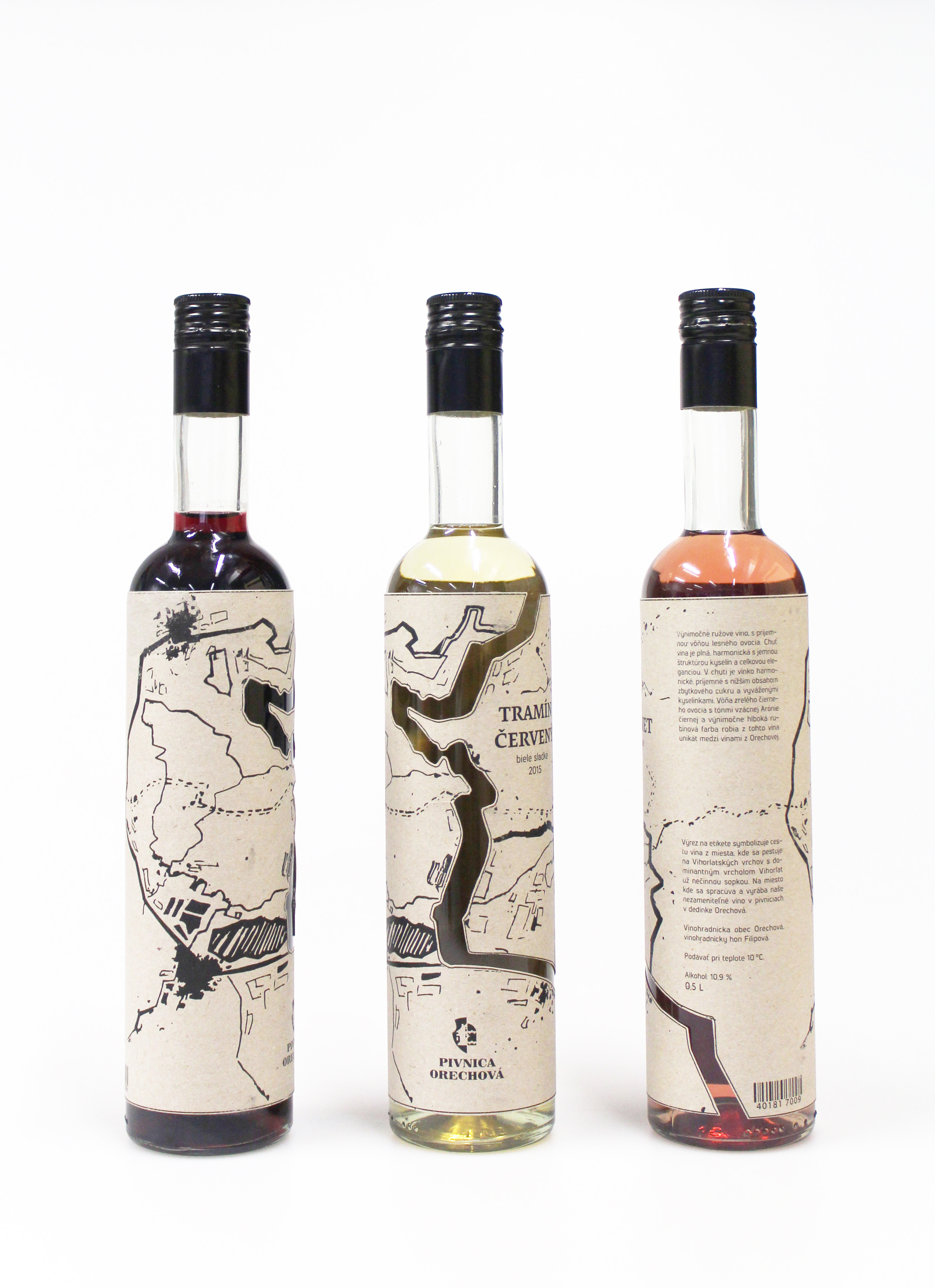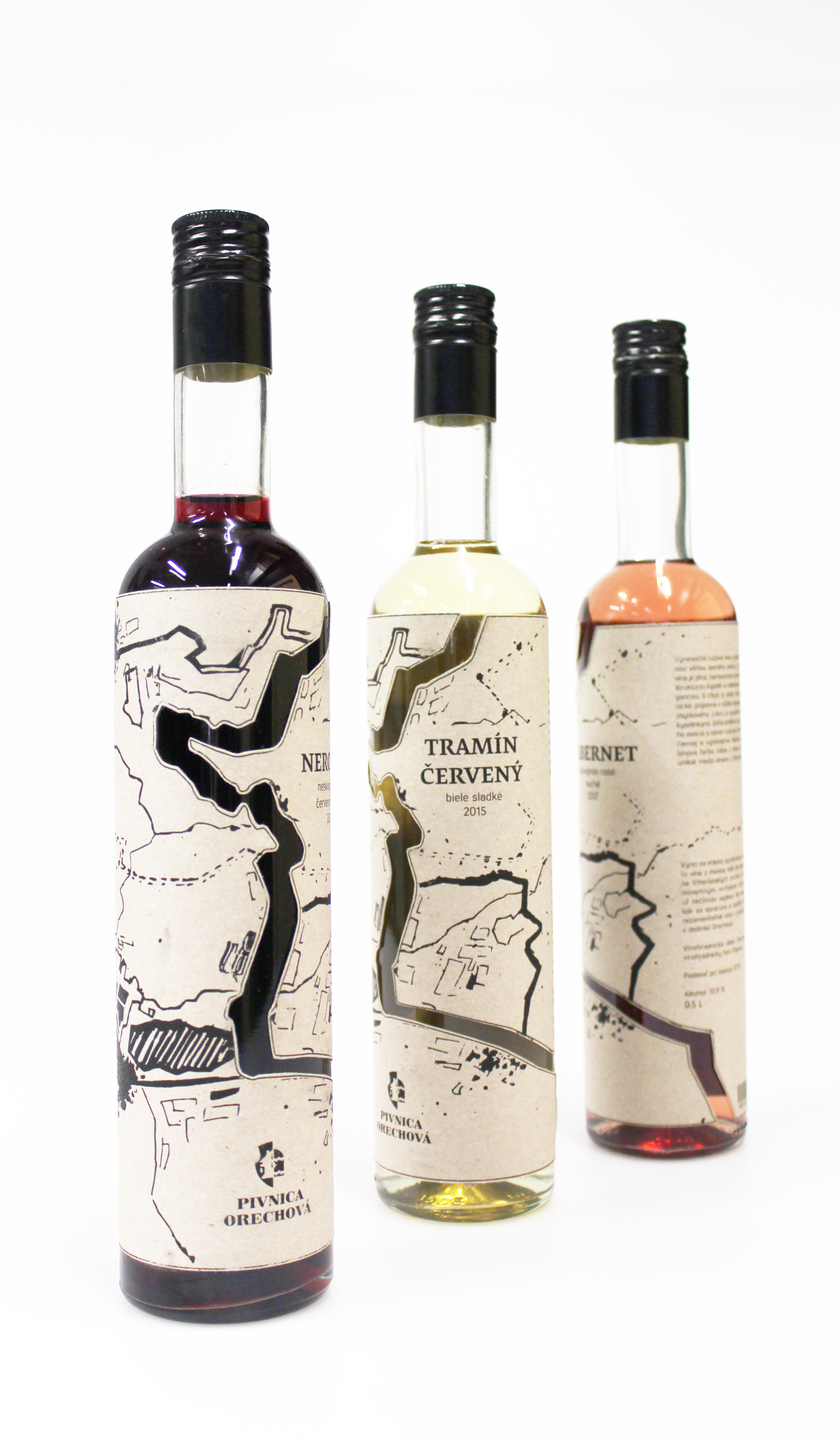 Etiketa je inšpirovaná starou mapou na ktorej je zobrazená konkrétna oblasť, kde sa pestuje a vyrába víno značky Pivnica Orechová. Na etikete je použitý výrez, ktorý symbolizuje cestu vína z miesta, kde sa pestuje na Vihorlatských vrchov na miesto spracovania a výroby vína v dedinke Orechová.