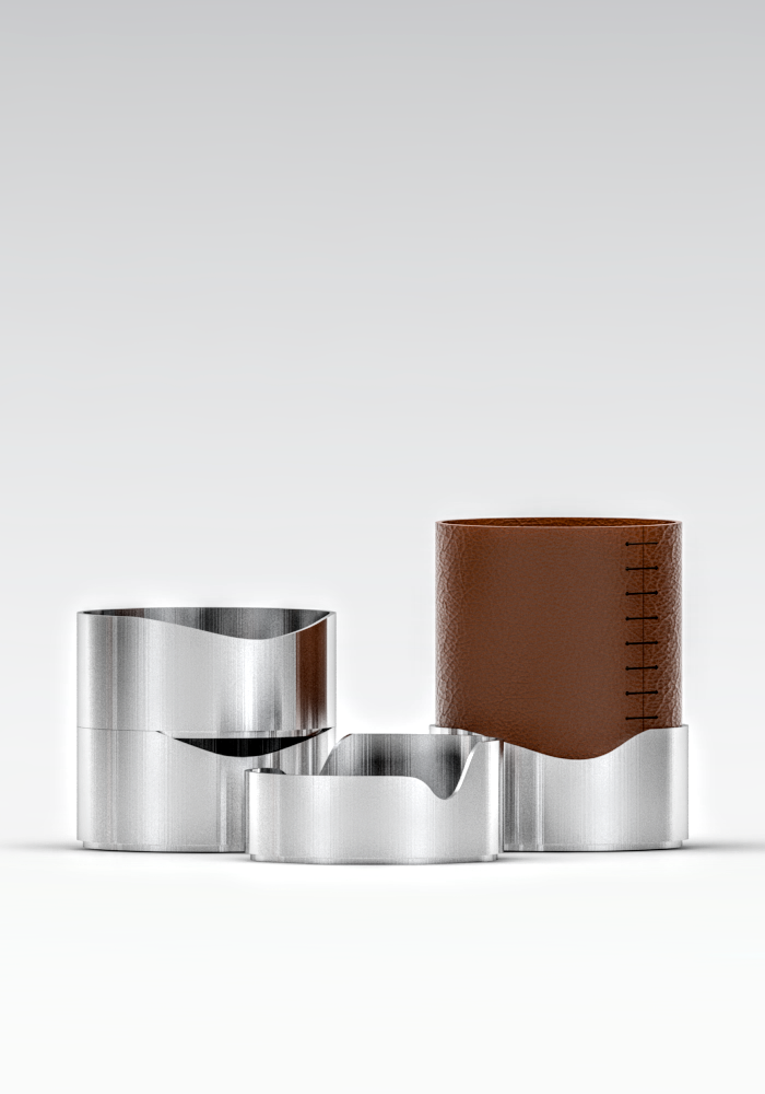 Sada piatich pomôcok, ktoré pomáhajú udržať poriadok na pracovnom stole. Vytvorené z antikoru a doplnené kožou. Produkty sa dajú na seba ukladať pomocou vysunutého dna, vďaka