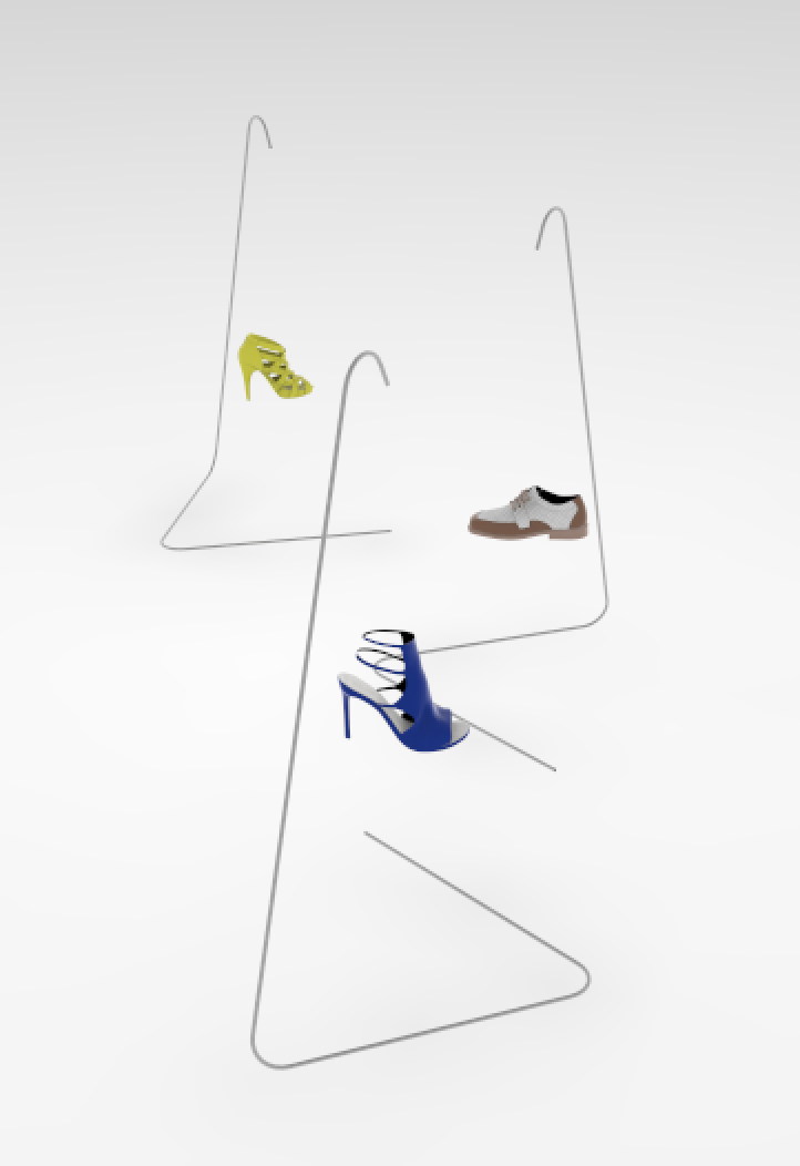 Celokovový stojan vyrobený z jednoho kusu vyváženého tak, aby unesl jeden kus obuvi. Jeho minimalistický design nechá vyniknout vystavovaný produkt, který je zavěšený v prostoru.